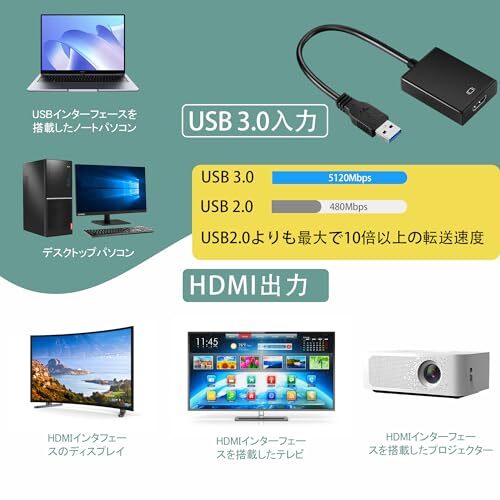 【1080p高解像度&5Gbps高速転送を備え】映像と音声の送信をまとめたUSB-HDMI変換アダプタは最大1080PのフルHDに対応できたうえに、USB3.0付きのパソコンを接続すれば、最大5Gbpsでのデータ転送が行えるため、画面の遅延やノイズが起こりにくく、高画質な映像や画像を快適に楽しむことができます。また、使用する前に以下の点に注意してください。USB側からHDMI側への単方向のみの映像データ転送ができるほか、このUSB-HDMI変換ケーブルはUSB2.0デバイスに接続する場合、解像度は800*600です。