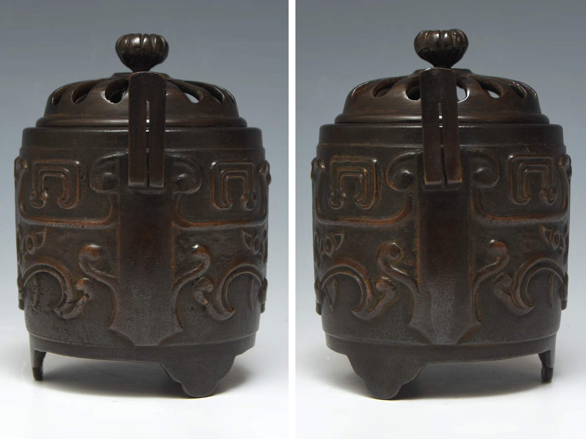 重厚な鋳肌に力強い文様が浮かぶ鋳銅香炉です。 左右に耳を備えた堂々たる造形で、香煙の立ち上るさまが美しく映えます。 秀正による確かな彫技と端正な意匠が調和し、古雅な趣を感じさせる作品です。 目立ったダメージ等なくコンディションは良好です。 ※予めご了承の上ご入札お待ちしております。 ※撮影の際に生じた写り込みなどがございます。 ご理解の程よろしくお願い致します。 |