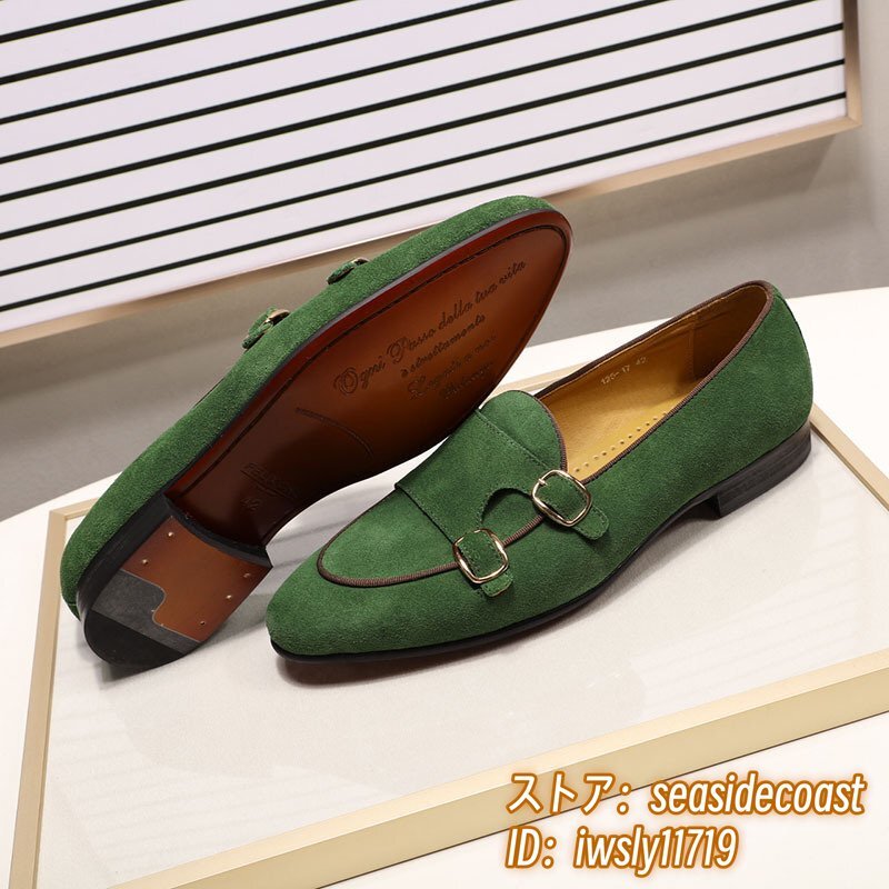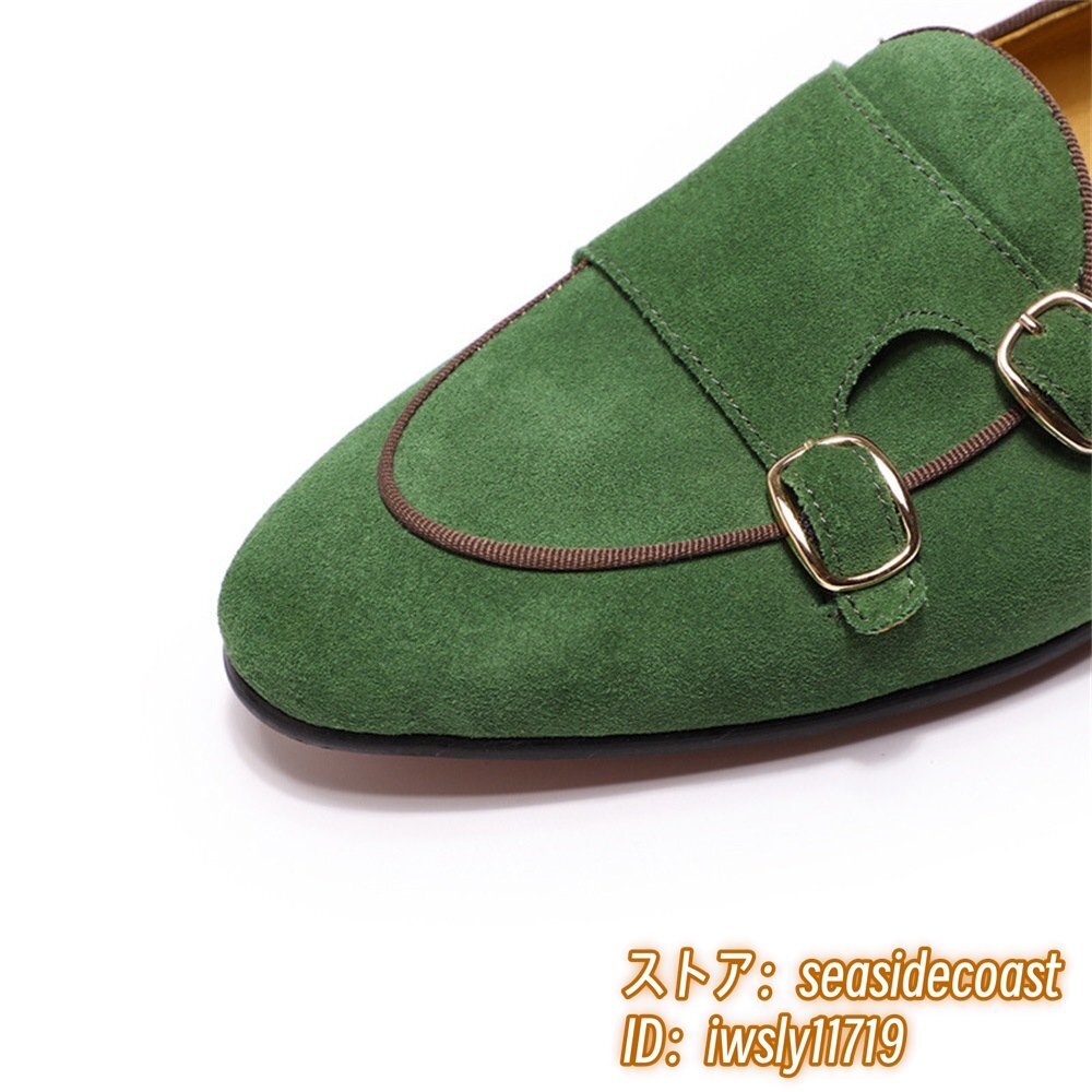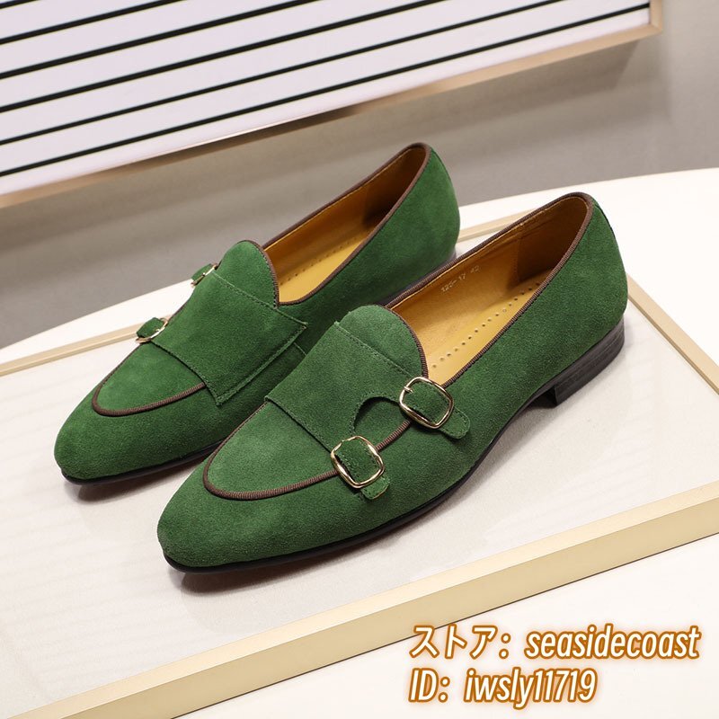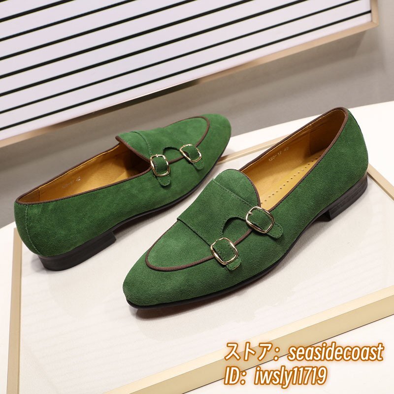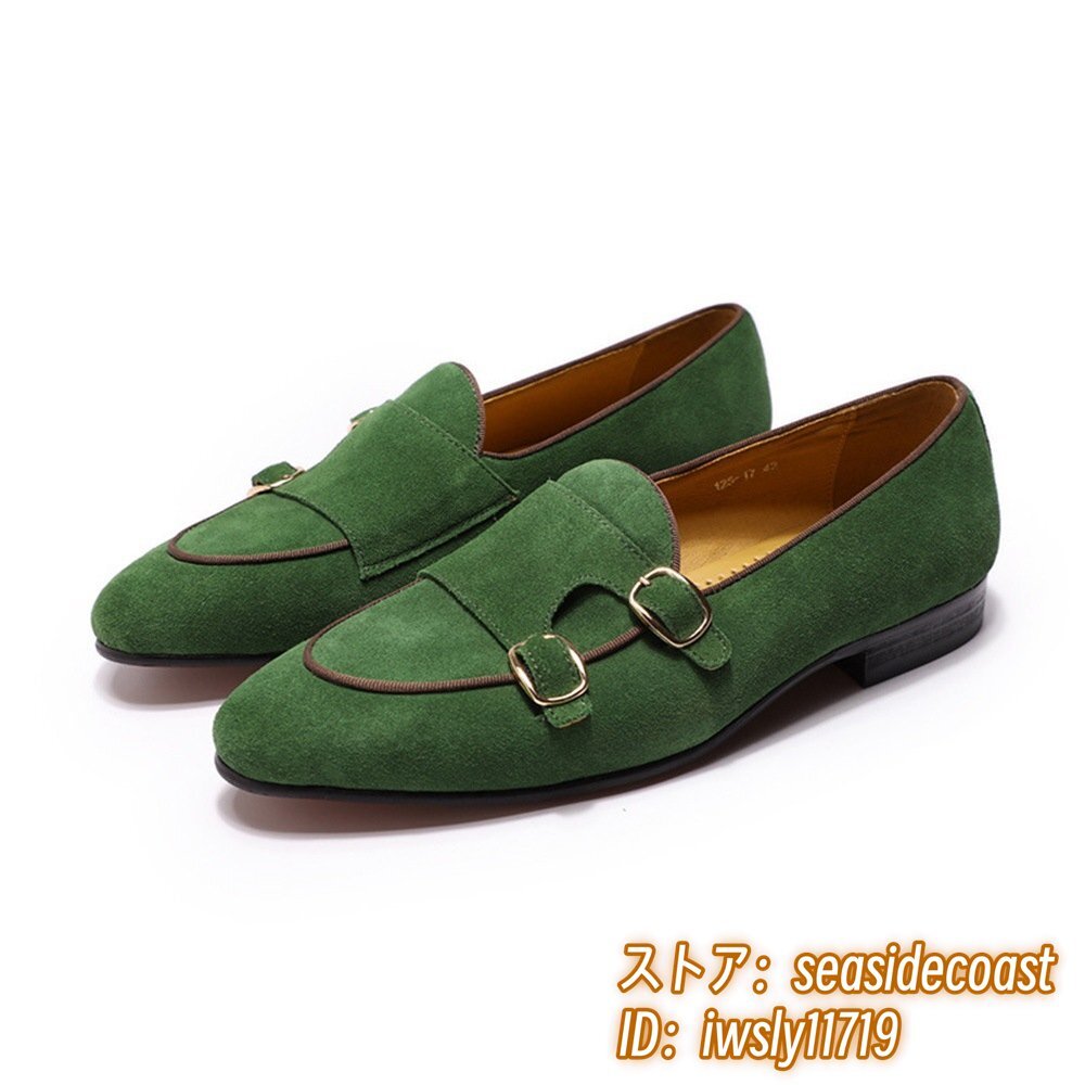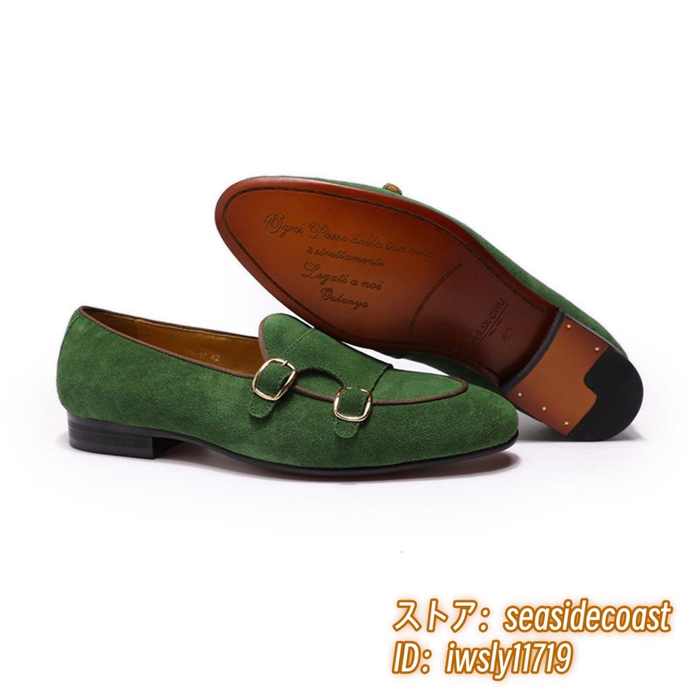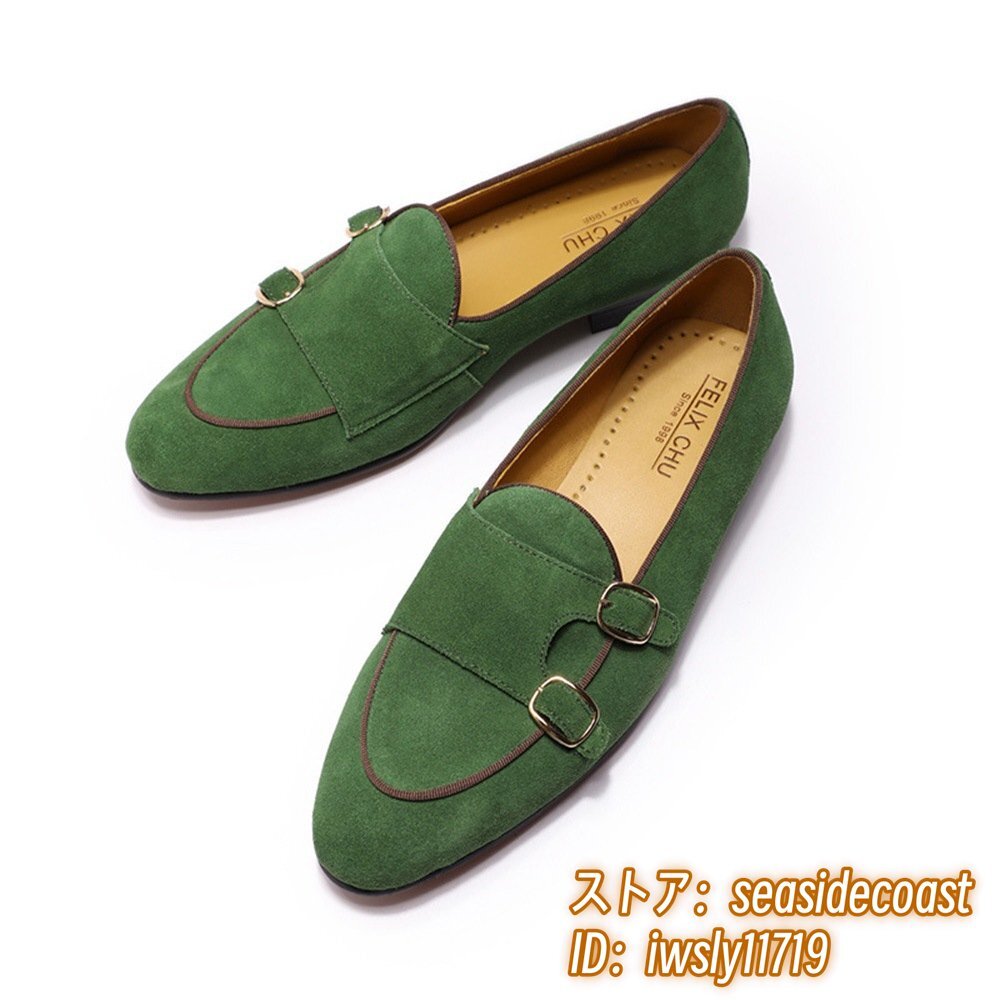 最高級◆定価9万 本革 ローファー 牛革 レザーシューズ モンクストラップ ビジネスシューズ 職人手作り スリッポン 革靴 紳士靴 緑 24.0cm