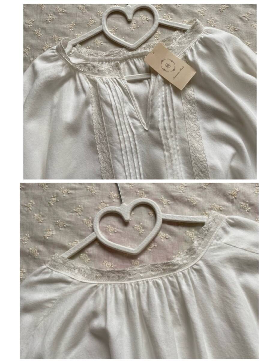 襟ぐり、前立てのトーションレースとスキッパーの抜け感がお洒落なブラウスです。
