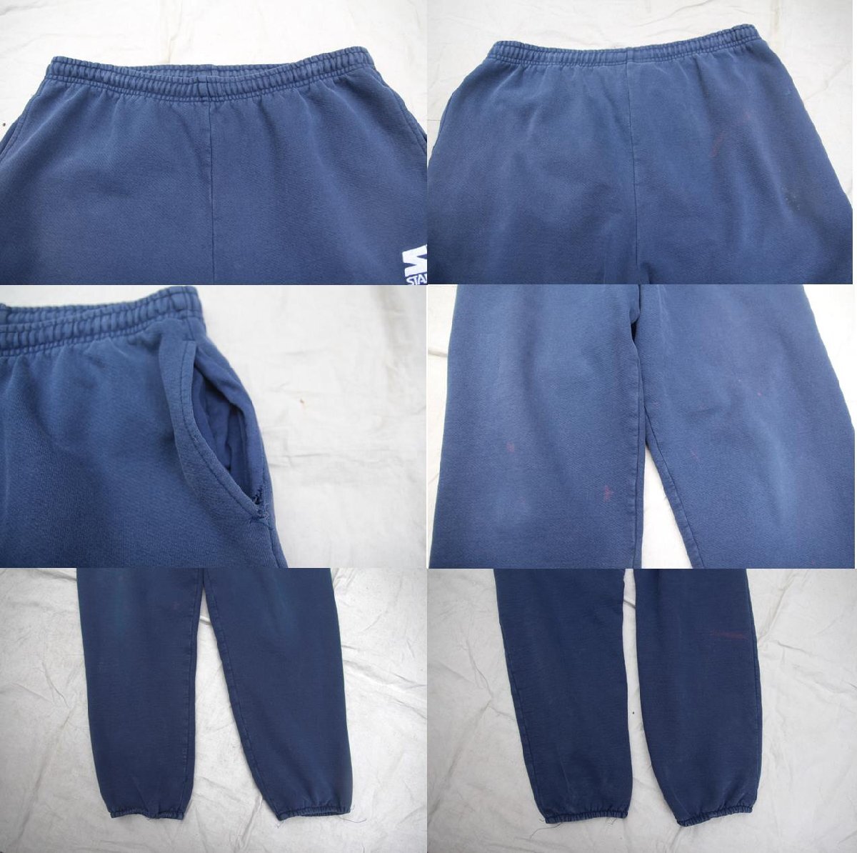 両膝付近にペンキ飛びの様な痕有り、お尻部分に褪せ汚れ有り、ポケット縫製端の細かい裂け有り、両裾のゴム生地に多少の伸び有り、ウエストのコードの伸び有り、全体的に色褪せ、生地伸び、細かい縫製解れ、使用感が見られます。