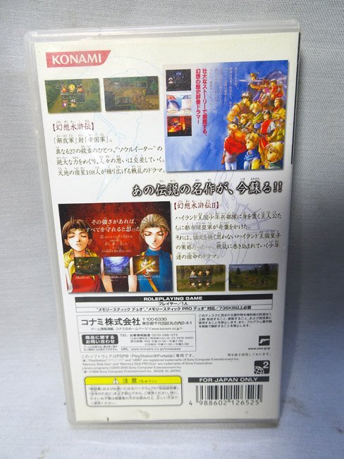 ■■商品詳細■■ メーカー : KONAMI 品名 : 幻想水滸伝Ⅰ&Ⅱ ※掲載写真は蛍光灯等の光の反射により、多少色の違いがある場合が御座います。 【商品説明】 こちらの商品は”ジャンク扱い品”で御座います。 ◆商品状態 ・・・使用に伴うスレ、キズや汚れが御座います。 本体が無い為動作の確認、ソフトの初期化が出来ておりません。 現状にてのお渡しとなりますのでご了承下さいませ。 画像にてご確認の程お願い致します。 特に特記する様な破損は御座いません。 記載事項をご確認、ご納得の上ご入札の程お願い致します。 ☆店頭でのお引取り大歓迎☆ 別途:この他にも“色々”出品しています 【ここクリック】でご覧下さいませ。 | ||