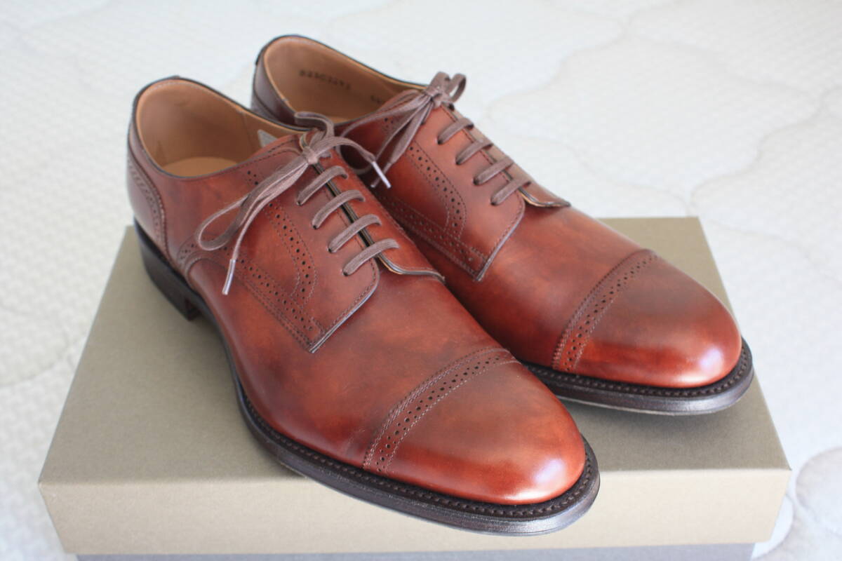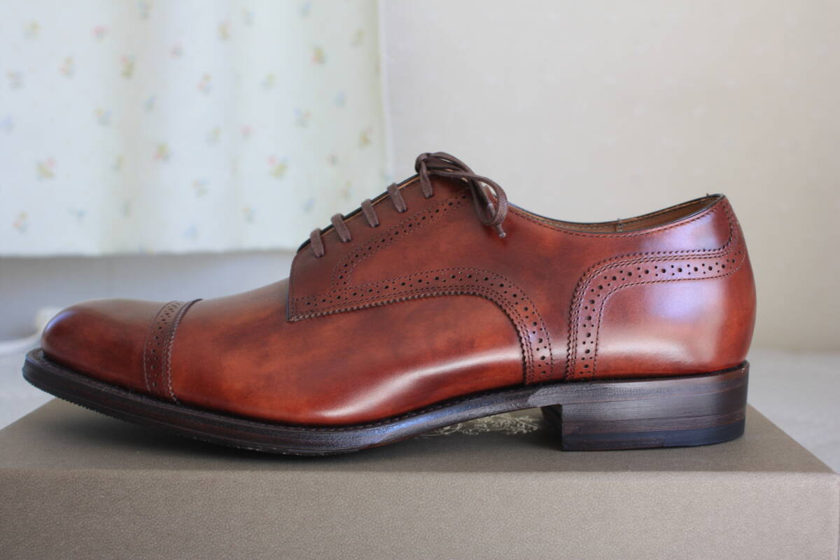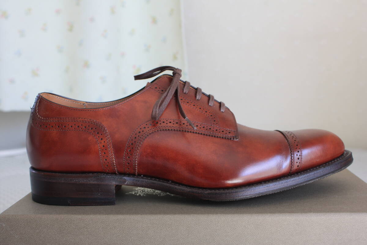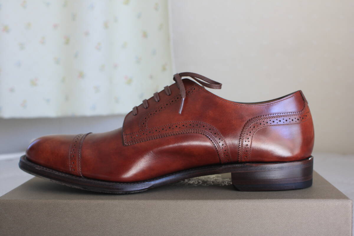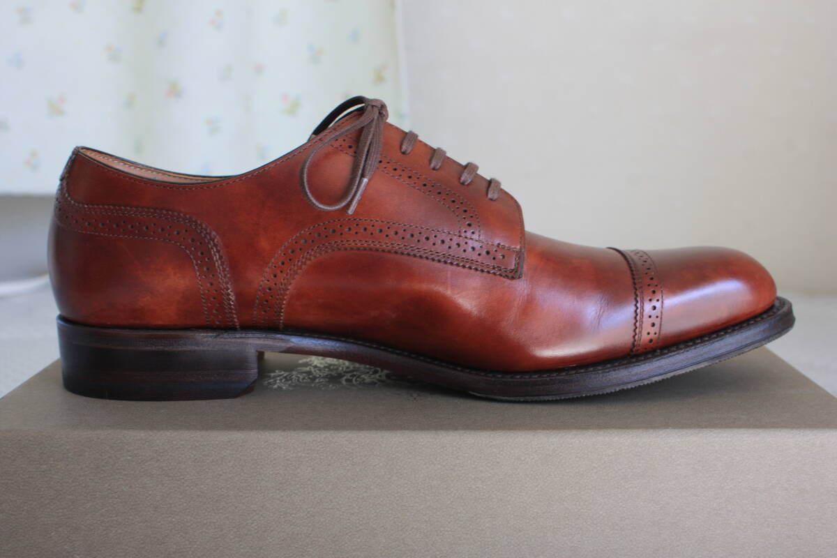 (当時、参考価格55000円) 調べたところ、このモデルは現在廃盤になっているようです。 現行、似たような品番がオンラインストアでありますがまったく別物です。当時、日比谷の限定別注、上位モデルという位置づけで少数ロットで販売されました。特徴は、アッパーレザーがイタリア、伊イルチアラディカカーフという高級な手染めカーフが使用されているモデルです。 職人が手作業で染料仕上げした革は、美しい光沢と色の深みがあります。 現在このアッパーレザーを使用したモデルは6万円以上するそうです。 この度、当方、革靴は多数所有しており、断捨離のため出品させて頂きました。当品につきましては、以下の「訳あり」です。 ①新品購入時に難波リッシュというカスタム専門店でハーフラバーソール仕様にカスタムしております。(ビブラムソール2340厚さ2mm) 上記の理由から、リセールバリューは減価しますが、靴自体は室内での試し履きを2度のみの新品で、最強のビブラムソールにカスタムしていますので、通勤等にガンガン履きたいという方にはお勧めできます。このモデルは仕事にも履けてそれとなくオシャレも楽しめるモデルだと思います。 上記の「訳あり」をご理解頂ける方のご購入ご検討宜しくお願い致します。廃盤になっているようですので、探しておられた方にはお勧めです。 ※当方タバコ吸いません、ペットもおりません。 宜しくお願い致します。箱ありです。