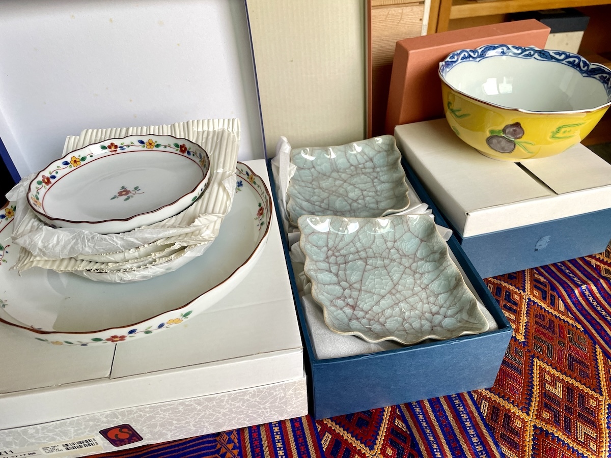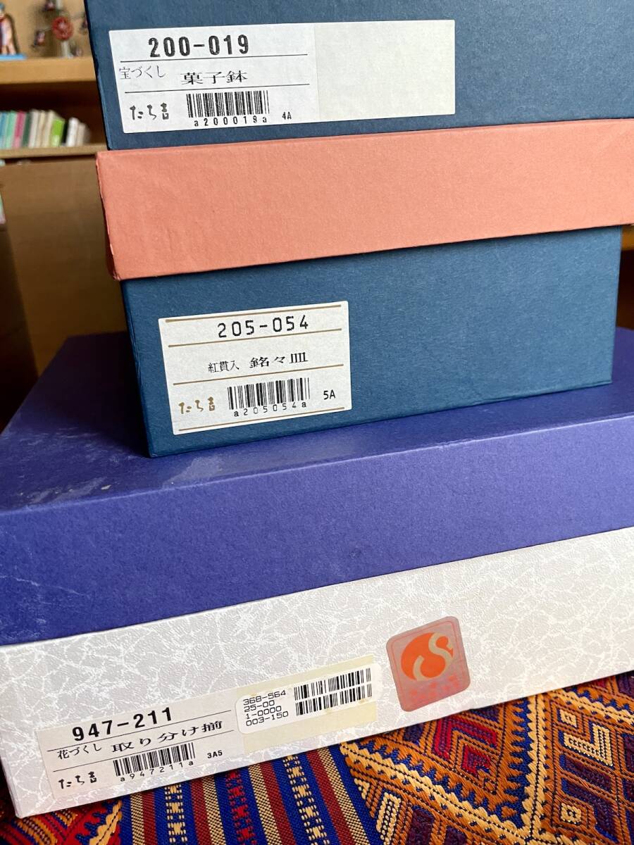 たち吉 未使用品 5点まとめて 宝づくし/菓子鉢 花づくし/取り分け揃 紅貫入/銘々皿 翡翠/花生 長期保管品■橘吉 和食器 花瓶 骨董■a833