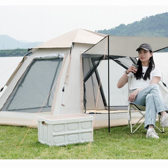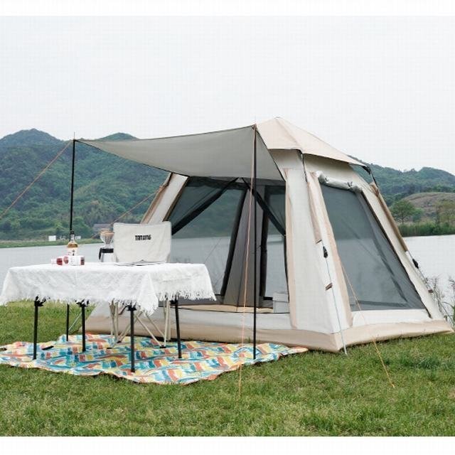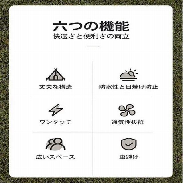 ワンタッチ式、一人でも5秒だけで簡単に設営できます、災害時の避難所などでも活躍します。製品はUVカット加工を採用しており、強い陽射しでも怖くないです。テント内側の紫外線対策はバッチリです。日差しからでも肌を守れます。