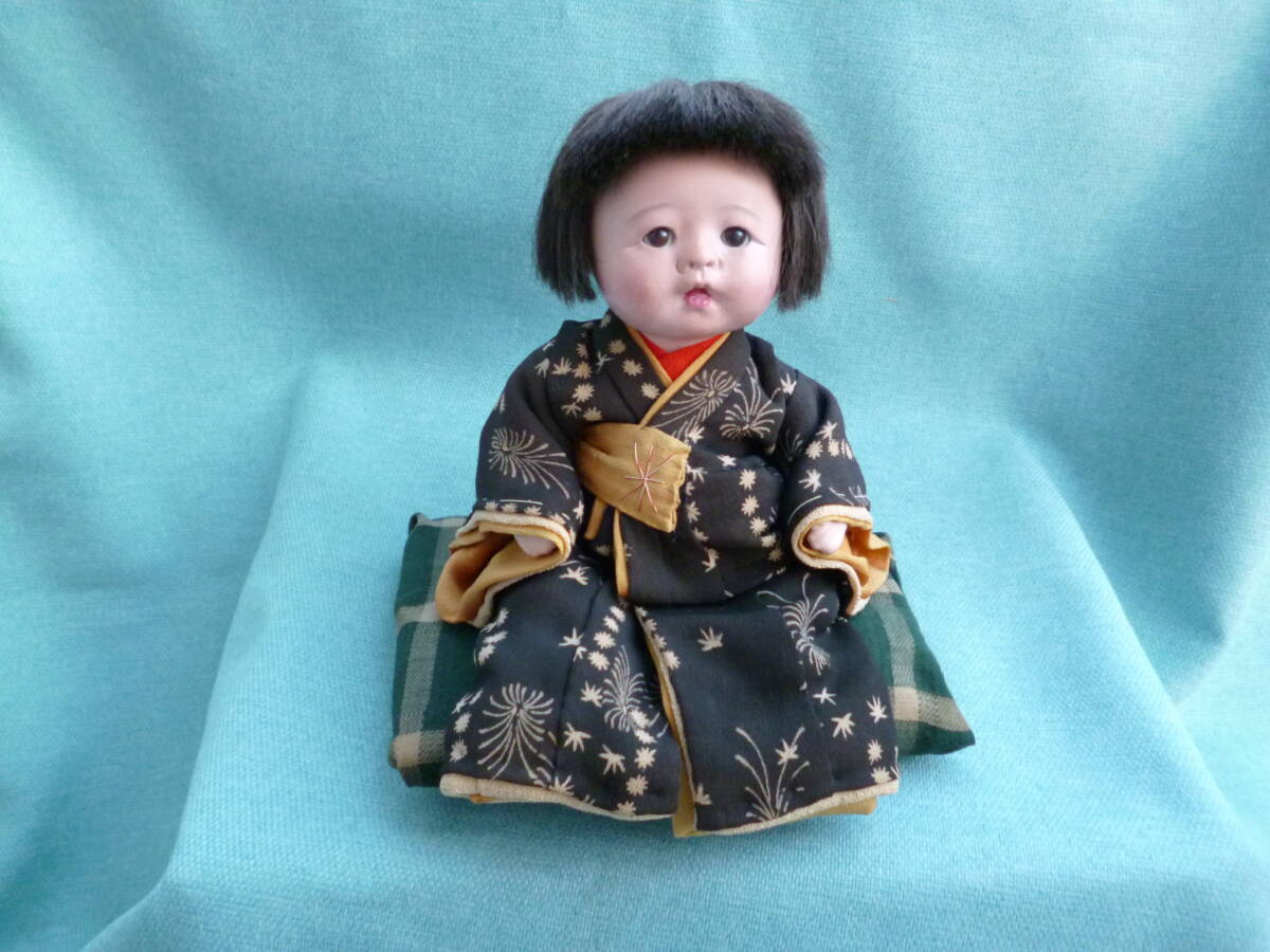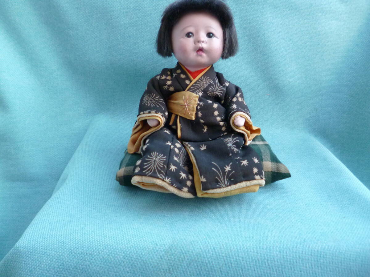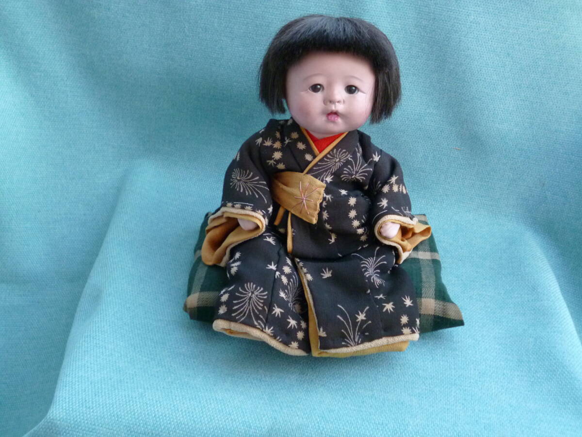 商品の状態は写真でご覧の通りです。江戸ちりめんを着た、古くて可愛い「市松人形」です。約20年前、旅行先の骨董店で購入し、私の趣味の部屋に飾っていました。外観では分かりませんが、着物の下の右腕の肩の部分を、セロテープで補強していますが、セロテープが古くなり固定があまり効いていません。右足のすねに、約3センチの細く浅いき裂があります。また、手、足の付け根は、もとは動いていたものと思われますが、動かないょうに固定されているようです。どのような経緯で、補強・固定になったかは分かりません。着物の上から取り扱う分には、何ら心配はありません。サイズ(約、座った状態)・高さ18センチ、幅17センチ、奥行15センチ。