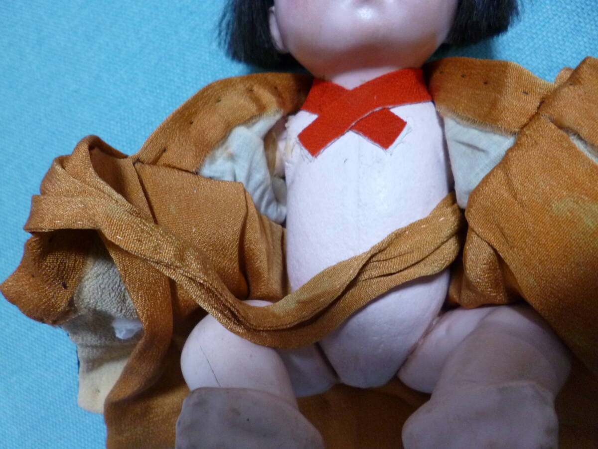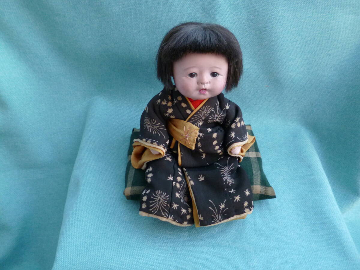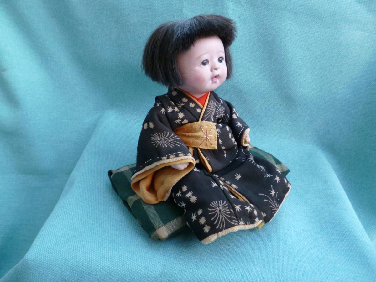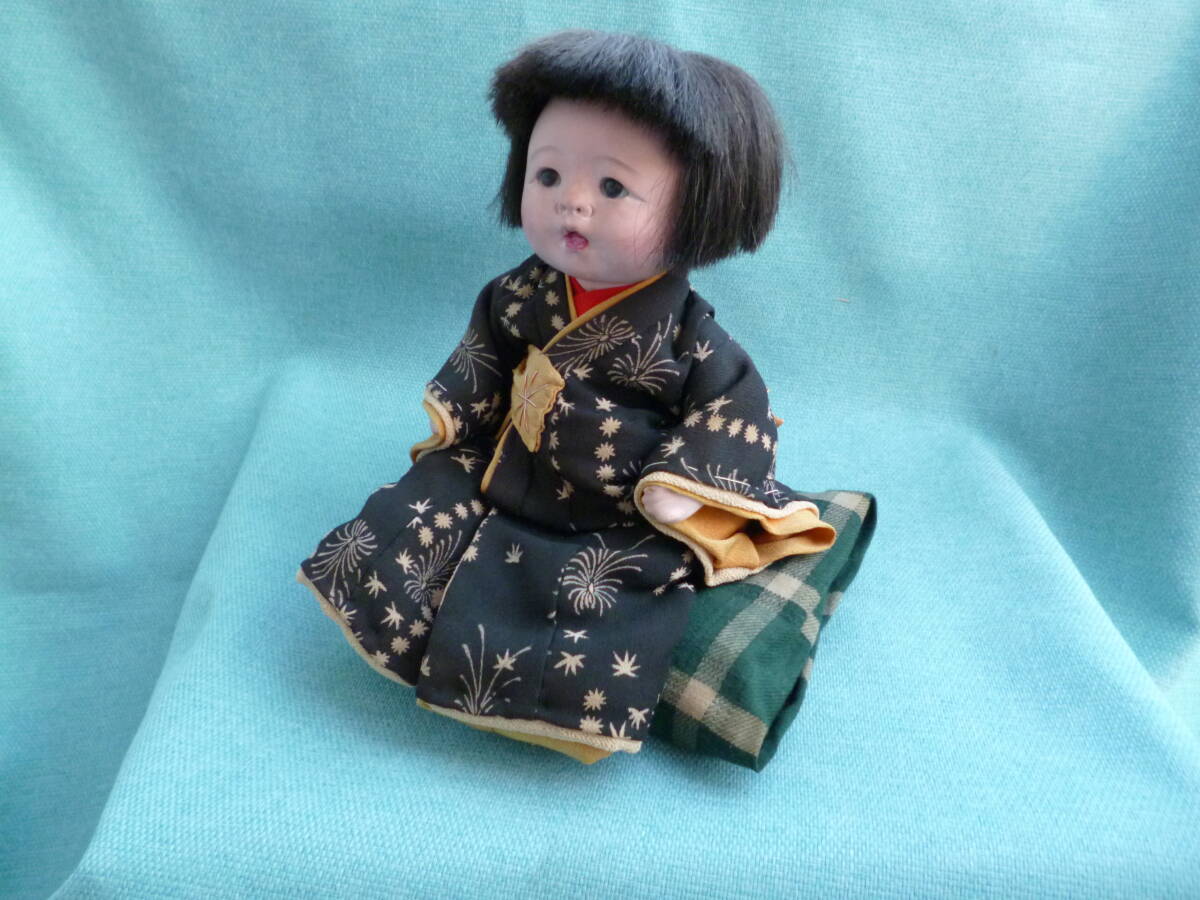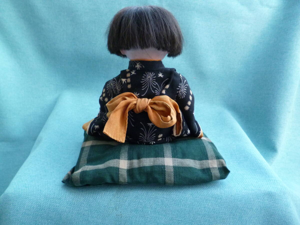 商品の状態は写真でご覧の通りです。江戸ちりめんを着た、古くて可愛い「市松人形」です。約20年前、旅行先の骨董店で購入し、私の趣味の部屋に飾っていました。外観では分かりませんが、着物の下の右腕の肩の部分を、セロテープで補強していますが、セロテープが古くなり固定があまり効いていません。右足のすねに、約3センチの細く浅いき裂があります。また、手、足の付け根は、もとは動いていたものと思われますが、動かないょうに固定されているようです。どのような経緯で、補強・固定になったかは分かりません。着物の上から取り扱う分には、何ら心配はありません。サイズ(約、座った状態)・高さ18センチ、幅17センチ、奥行15センチ。