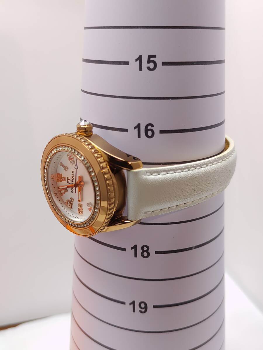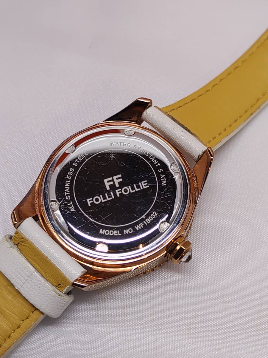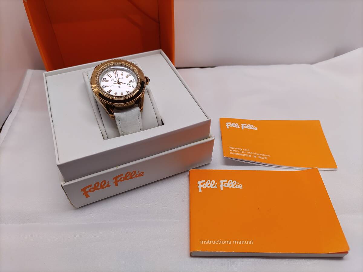 ギリシャ発の人気ブランド「Folli Follie(フォリフォリ)」から、ローズゴールドとクリスタルが輝く、エレガントなレディース腕時計です。 正規販売店の保証書、純正BOX、取扱説明書が揃っています。正常に稼働しており、使用感の少ない良品です。