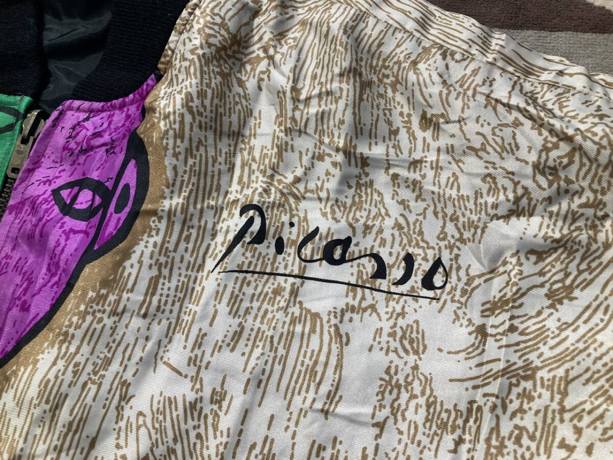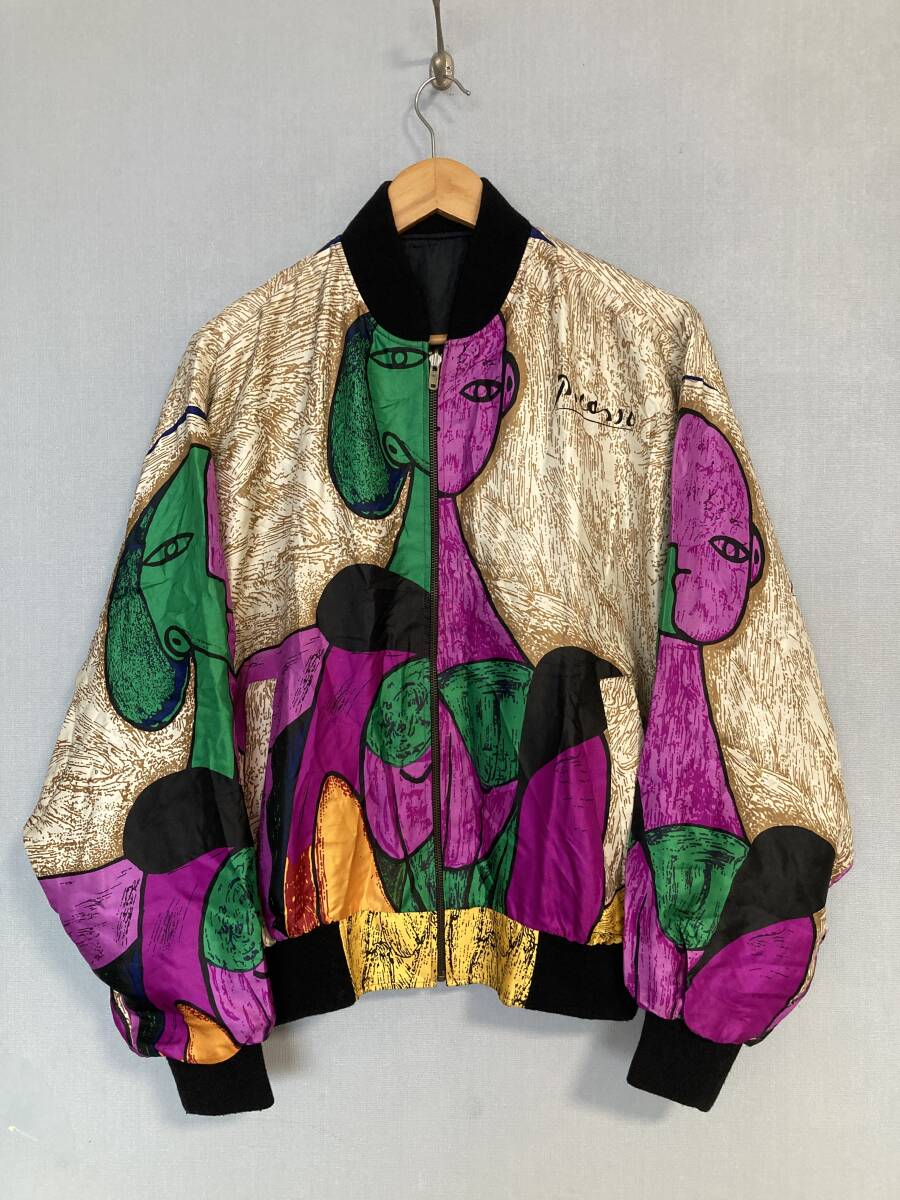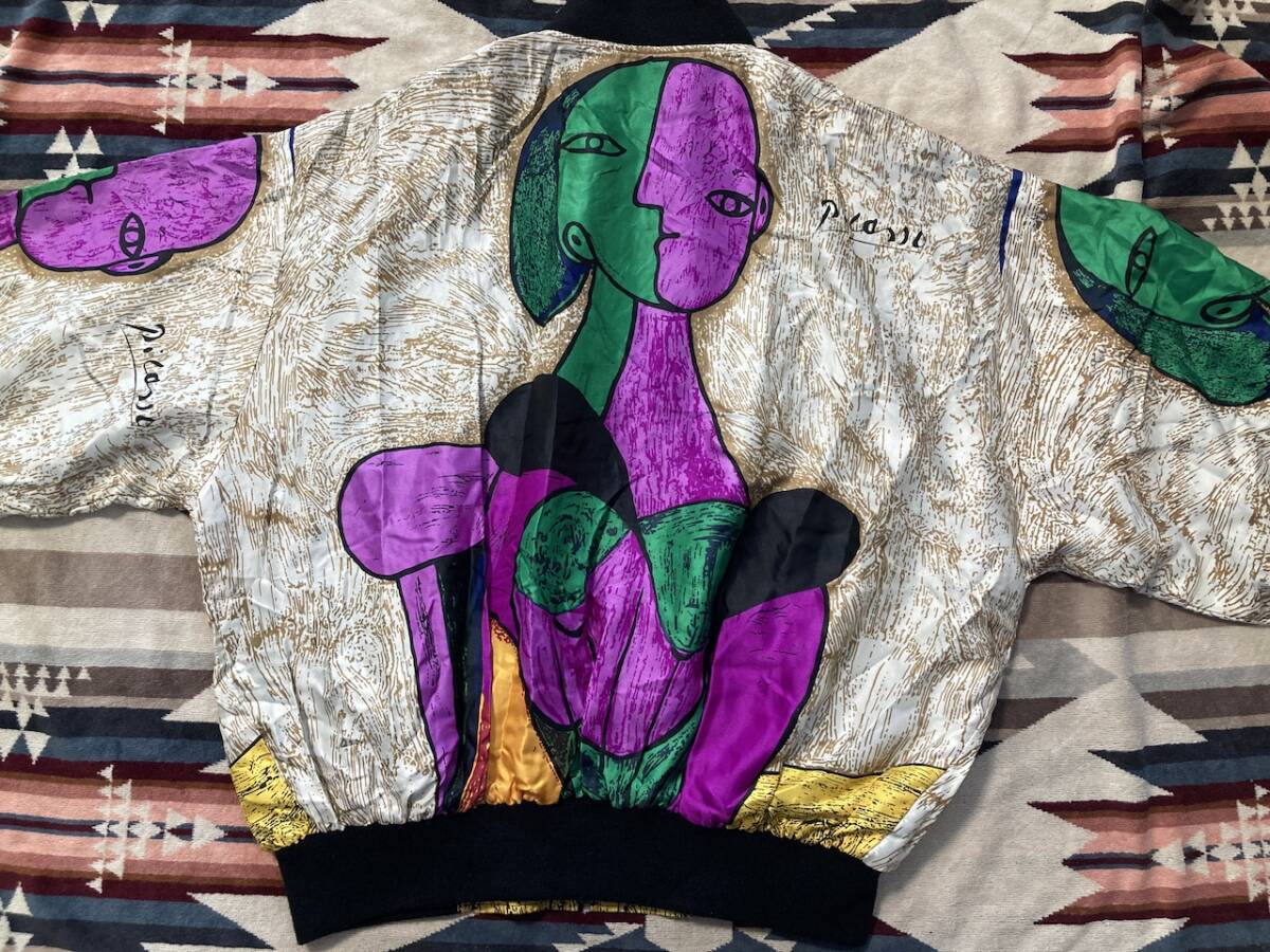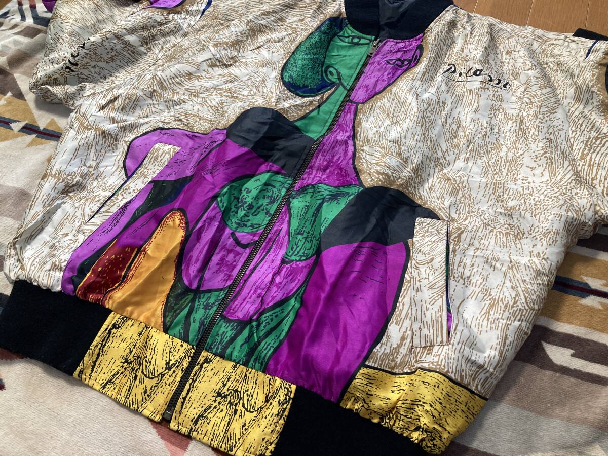 商品名:90s Picasso 総柄 ZIPジャケット サイズ:表記なし(M~L位※実寸を参考にしてください) 平置き肩幅57cm 身幅(脇下~脇下)67cm 着丈(襟リブ付根~裾)62cm 袖丈(肩~袖先)58cm ※素人採寸の為多少の誤差はご了承下さい。 カラー:ベージュ系、パープル、グリーン 状態:品質表記タグ等無し。ナイロン、シルク、サテン系生地。ポケット×2。袖先付近に小傷あり(画像8)。内側両アームホールにダメージリペアあり(画像9、10)。その他幾分かの使用感等ありますが目立ったダメージ無く一般古着程度だと思います。発送方法:レターパックプラス(配達記録付600円)orレターパックライト(配達記録なし430円) ※古物になりますので神経質な方、御理解の無い方の御入札はお控え下さい。送料、振込手数料は落札者様の御負担となります。ノークレーム、ノーリターンでお願い致します。