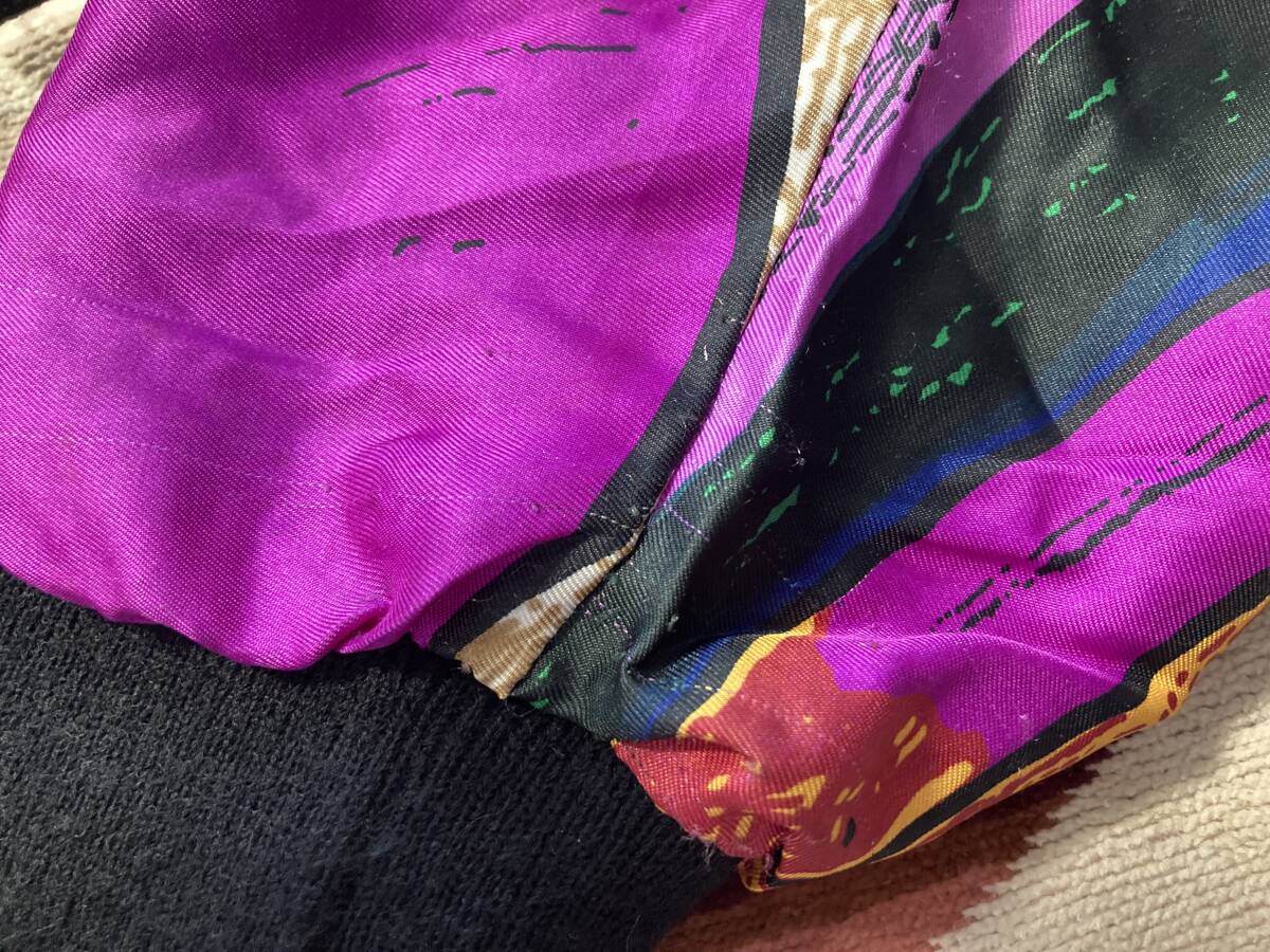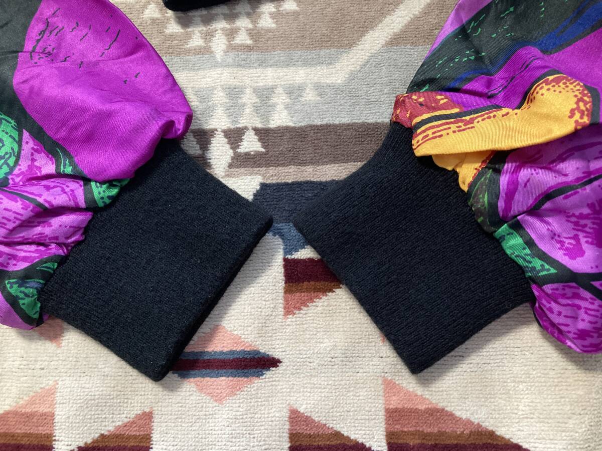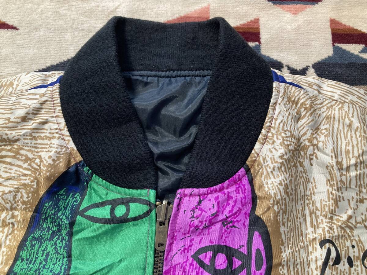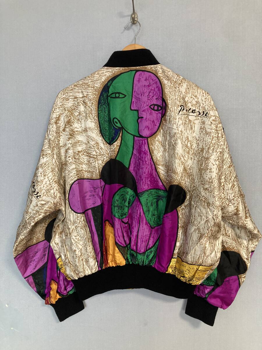 商品名:90s Picasso 総柄 ZIPジャケット サイズ:表記なし(M~L位※実寸を参考にしてください) 平置き肩幅57cm 身幅(脇下~脇下)67cm 着丈(襟リブ付根~裾)62cm 袖丈(肩~袖先)58cm ※素人採寸の為多少の誤差はご了承下さい。 カラー:ベージュ系、パープル、グリーン 状態:品質表記タグ等無し。ナイロン、シルク、サテン系生地。ポケット×2。袖先付近に小傷あり(画像8)。内側両アームホールにダメージリペアあり(画像9、10)。その他幾分かの使用感等ありますが目立ったダメージ無く一般古着程度だと思います。発送方法:レターパックプラス(配達記録付600円)orレターパックライト(配達記録なし430円) ※古物になりますので神経質な方、御理解の無い方の御入札はお控え下さい。送料、振込手数料は落札者様の御負担となります。ノークレーム、ノーリターンでお願い致します。
