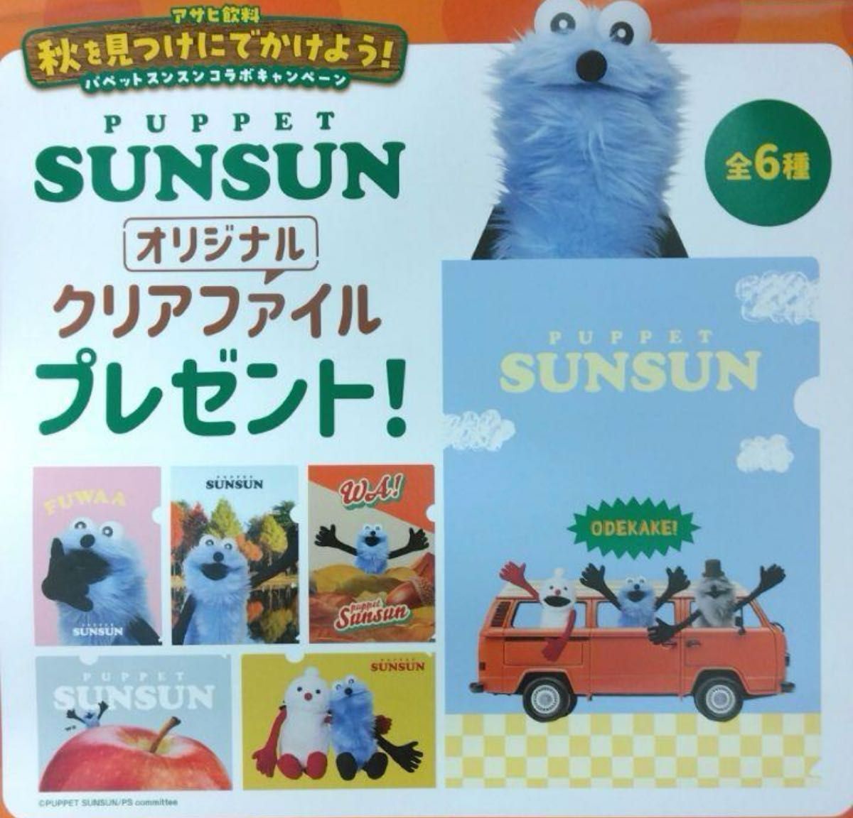 アサヒ PUPPET SUNSUN オリジナルクリアファイル  全6種類になります。    ※吊り下げ部分は切り離さず、折って発送致します。