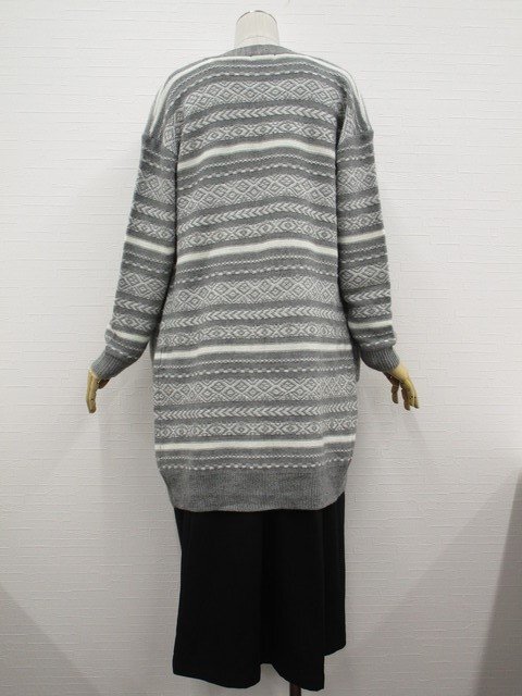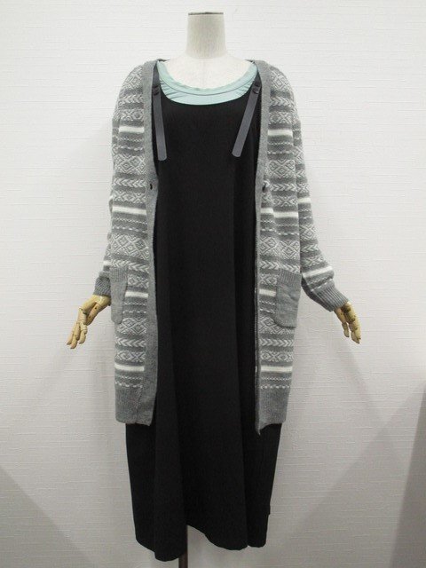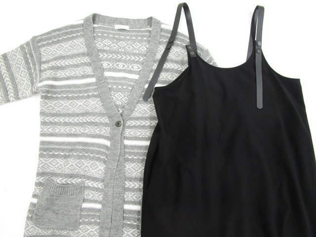 長袖ニットカーディガン+ロング丈ジャンパースカート+長袖カットソー コーディネート3点セット M相当 グレー×ホワイト ボーダー柄&総柄/ブラック/グリーン系 カジュアル系 20代