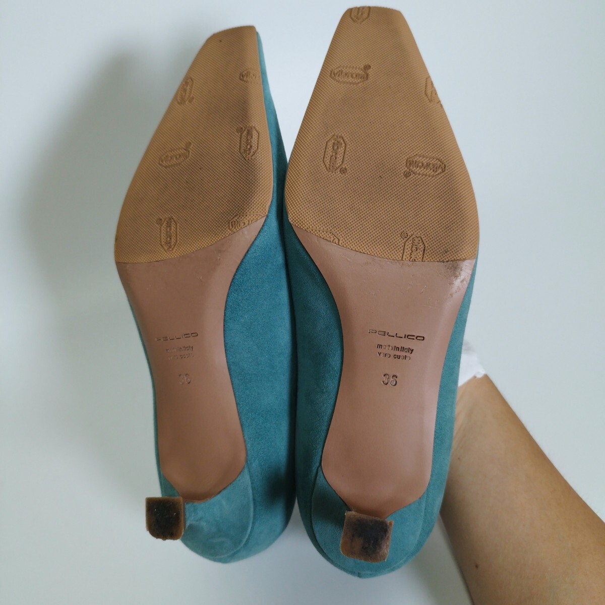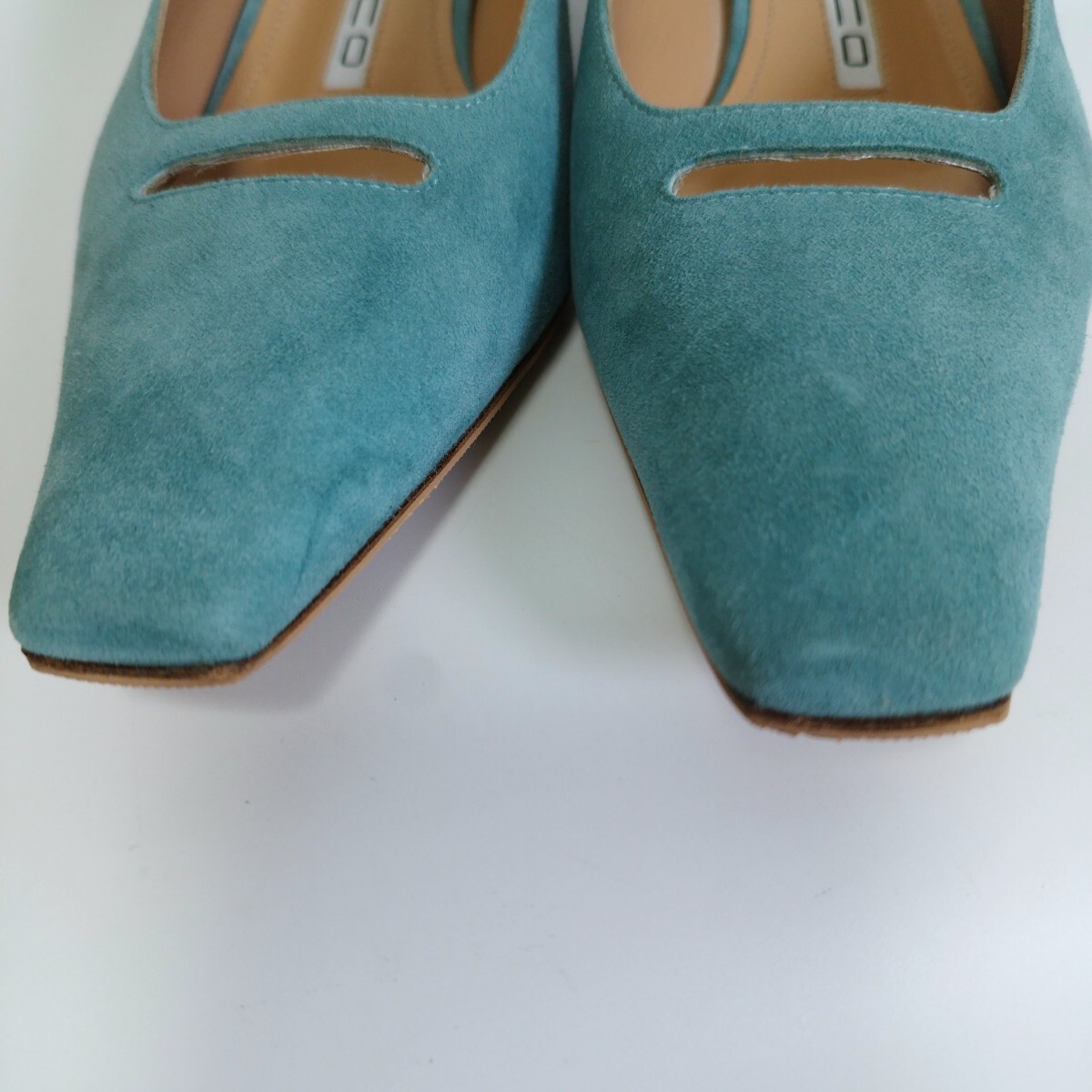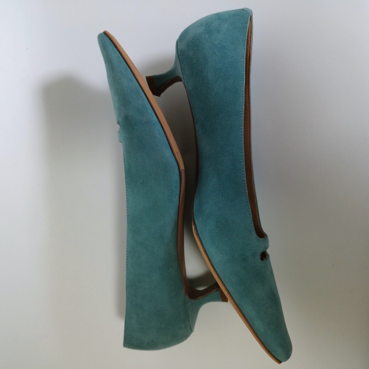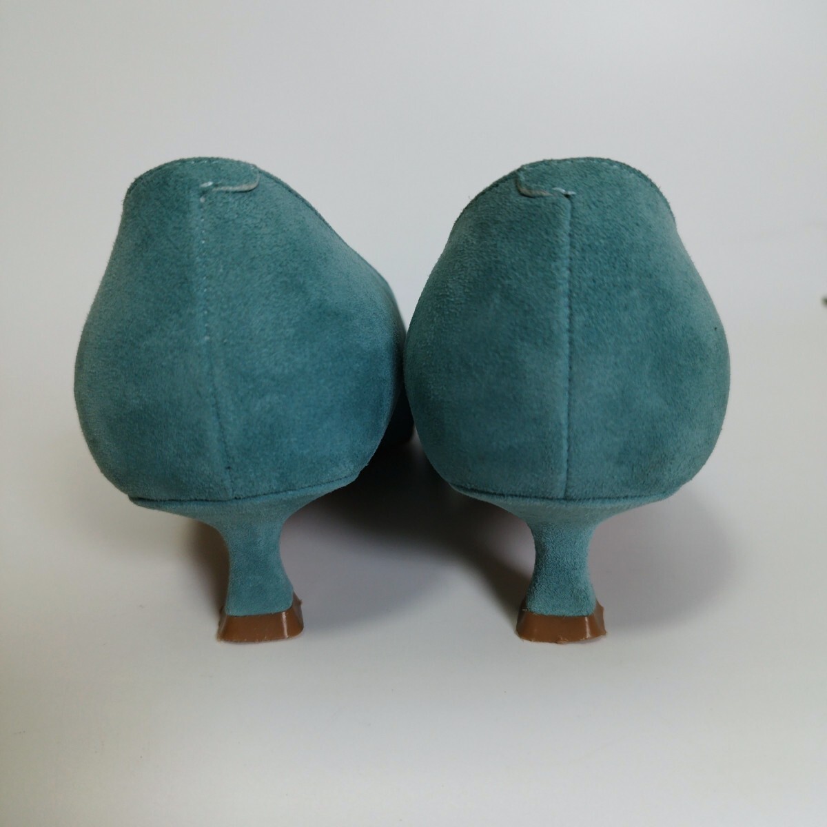 美しいセミスクエアトゥとくすみ感のあるブルーグリーンが、シンプルながらも洗練された足元を演出。