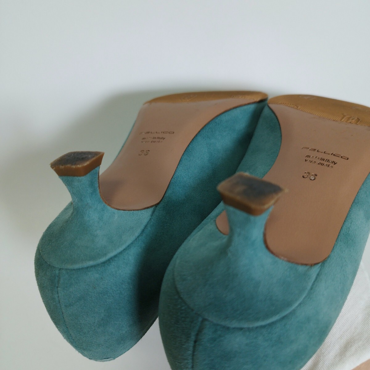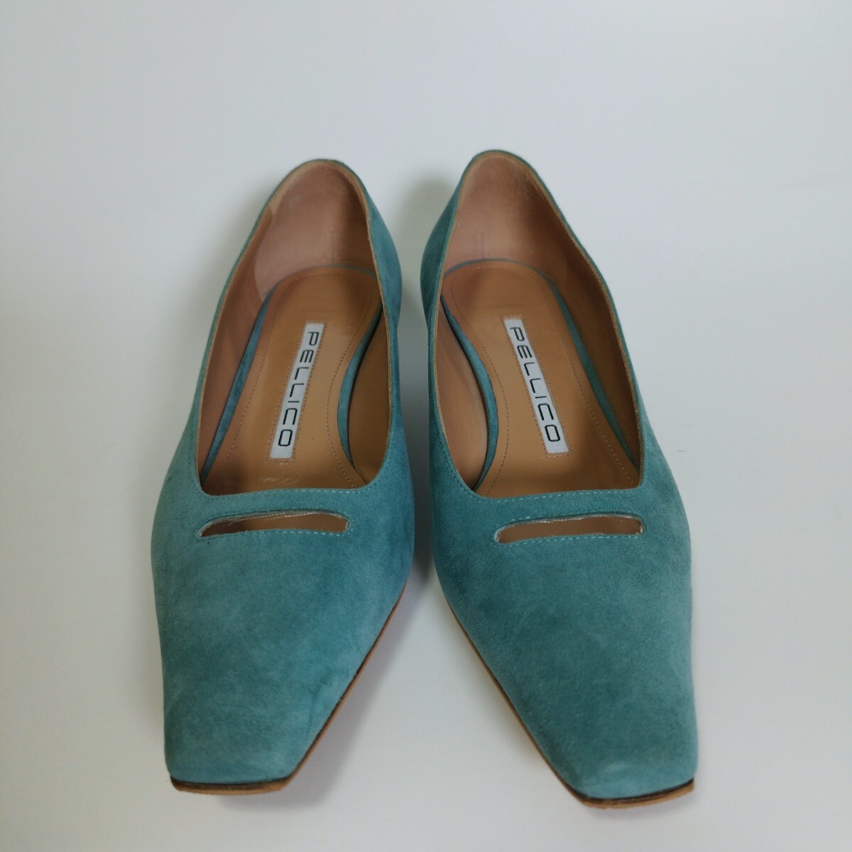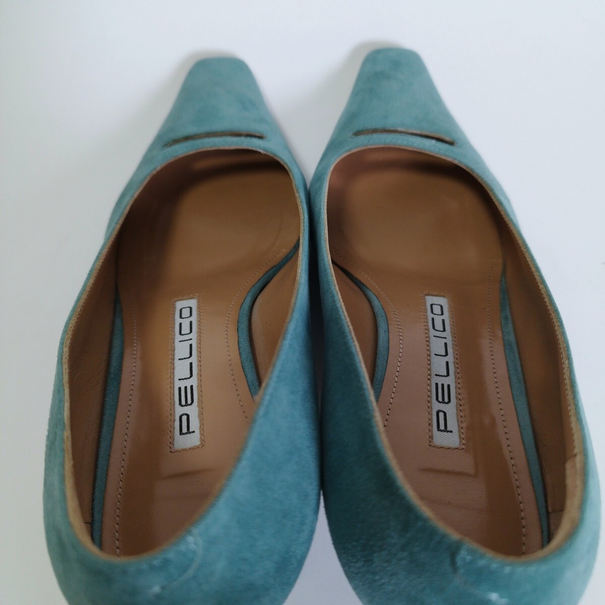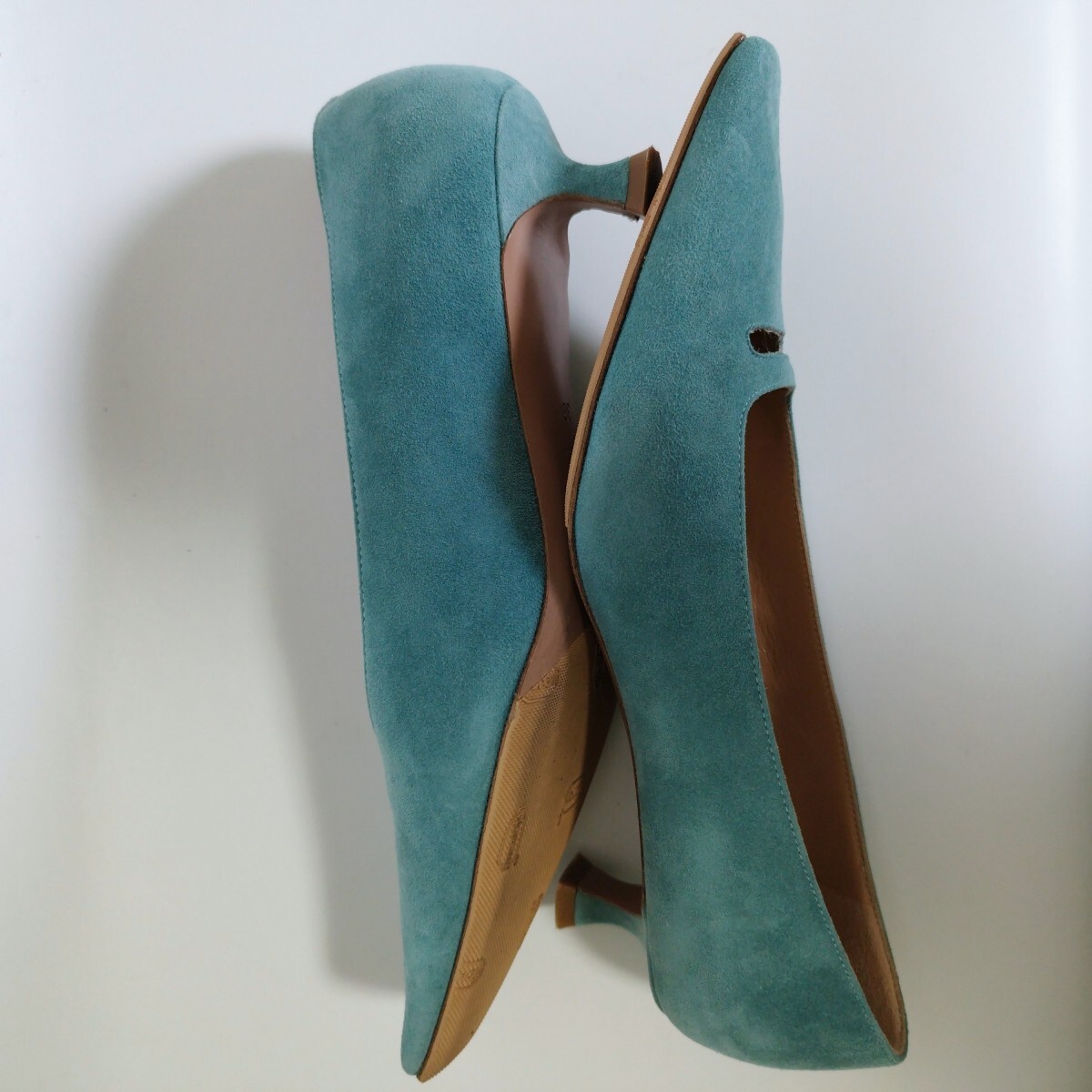 美しいセミスクエアトゥとくすみ感のあるブルーグリーンが、シンプルながらも洗練された足元を演出。
