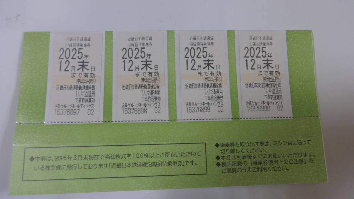 近鉄株主優待乗車券4枚 有効期限は2025年12月末までです。