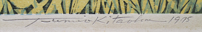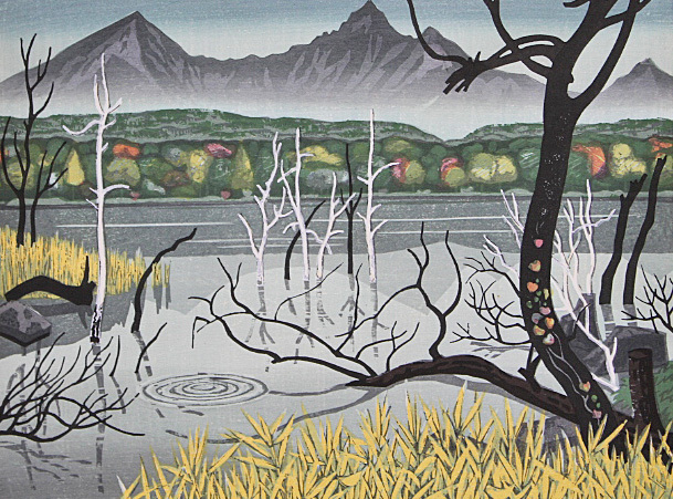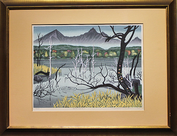■北岡文雄 【晩秋の五色沼】 1975年 木版画 直筆サイン エディション有り