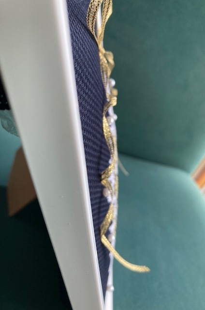 紺の布に、白とゴールドの2色の糸で刺繍をし、