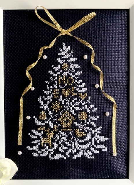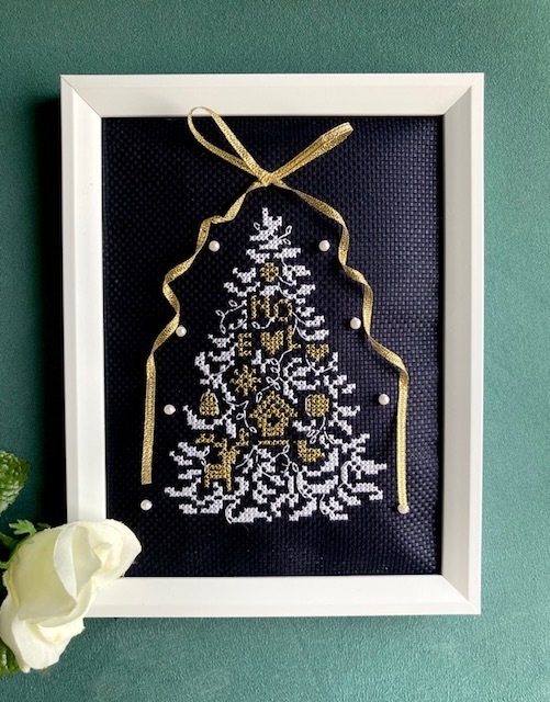 クリスマス・おしゃれなクリスマスツリー・紺・クロスステッチ・ハンドメイド・フレーム入り