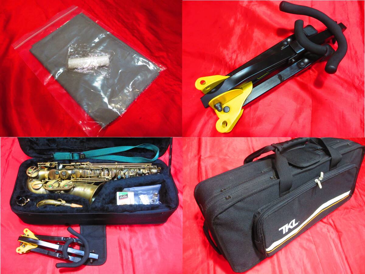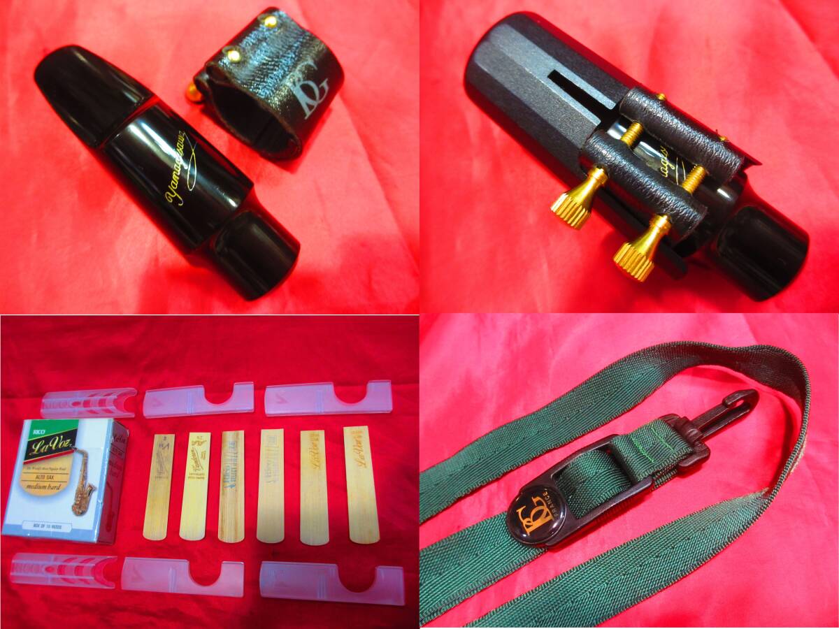 ・おまけとして、ヤナギサワ製(エボナイト3番、歯形無し美品)、リガチャー(フランスBG社製ダブルスクリュー、キャップ付美品)、モニター用リード6枚(バンドレン、ラ・ボーズ、セレクトジャズ新品)、スタンド(ハーキュレス製、折りたたみ式美品)、マイクロファイバークロス(L版、新品)が付いています。