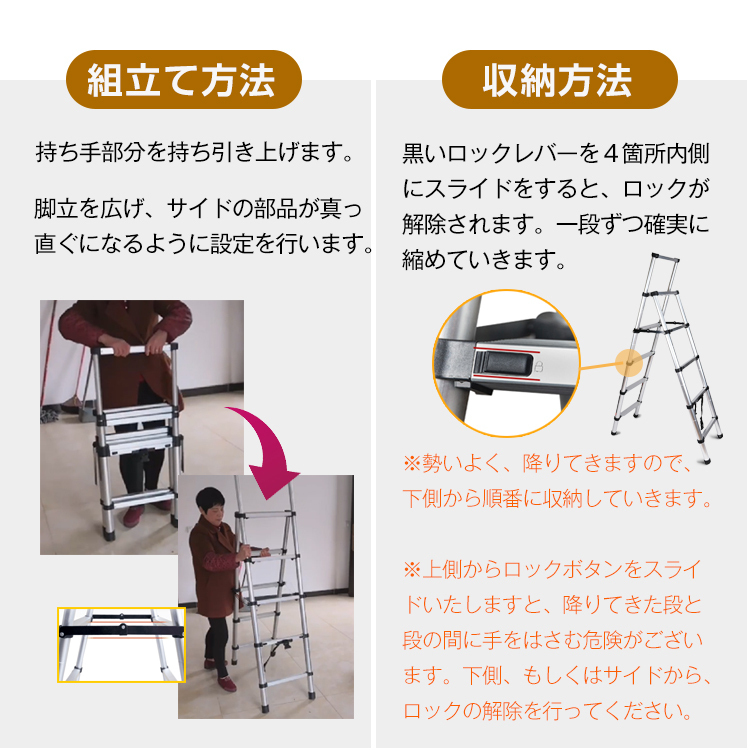 ※伸縮時にラダー部分が勢いよく飛び出す場合などがございます。
