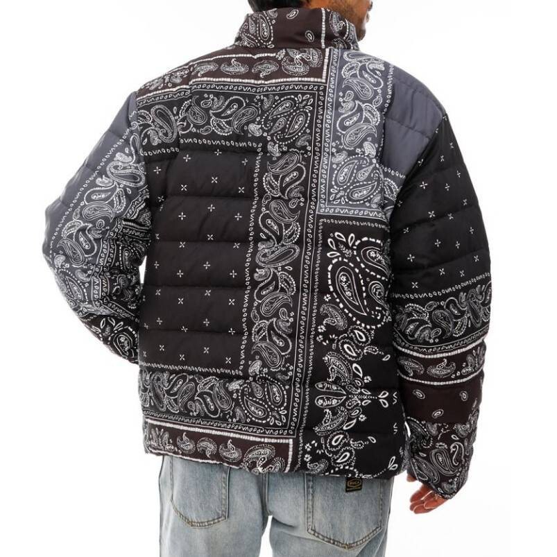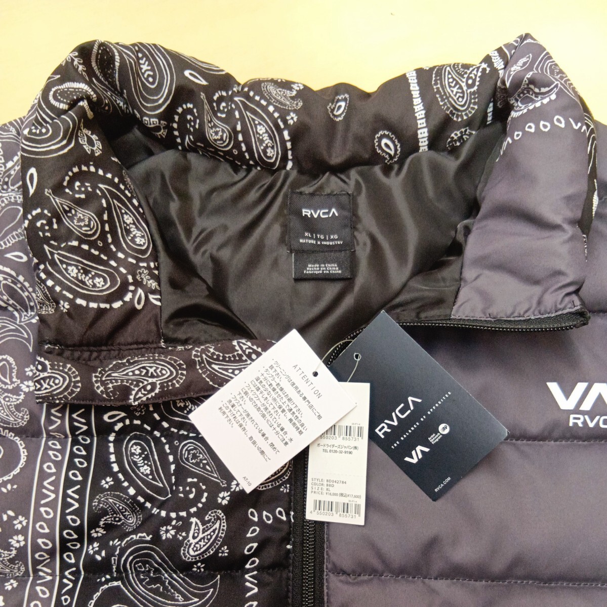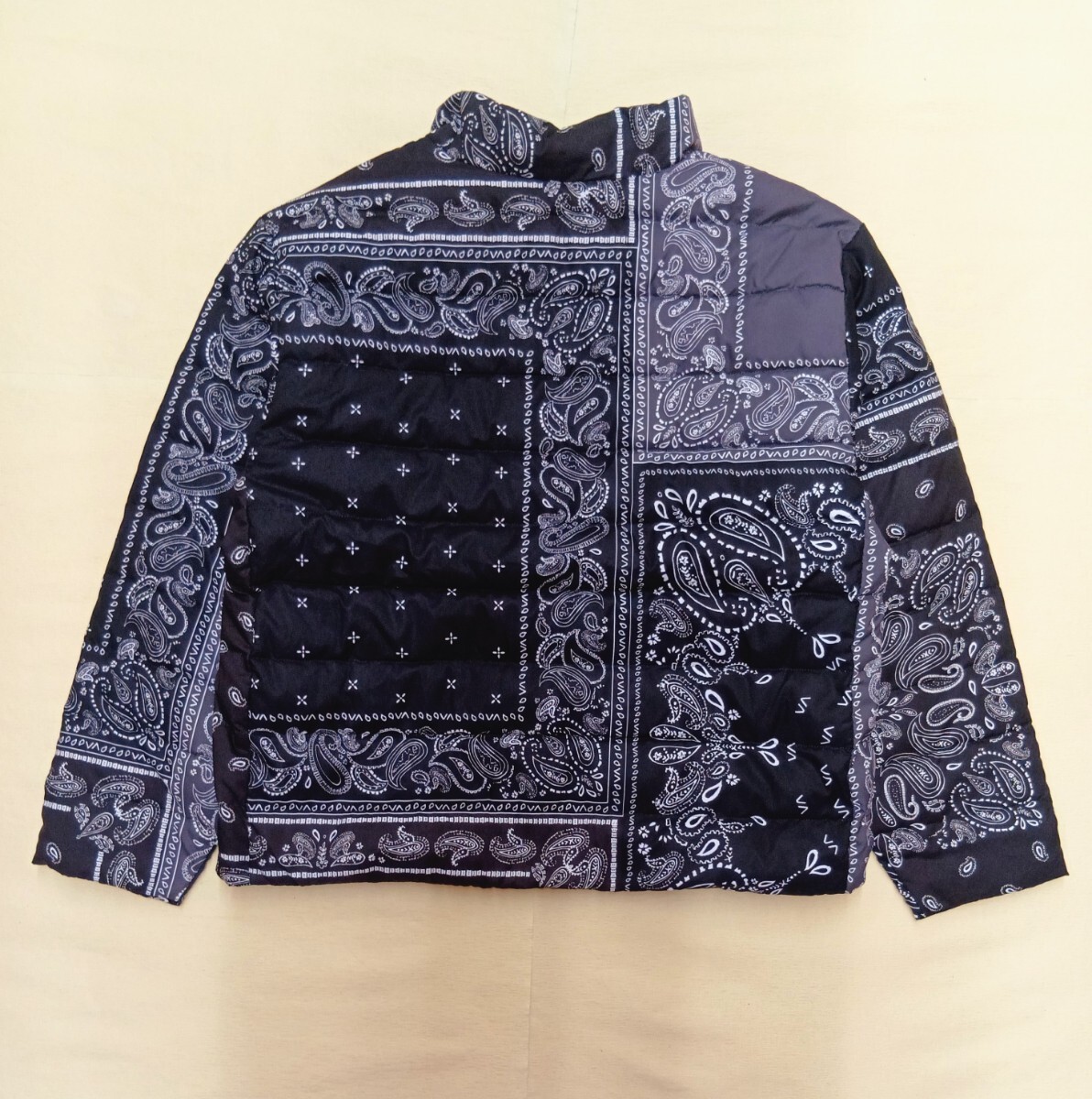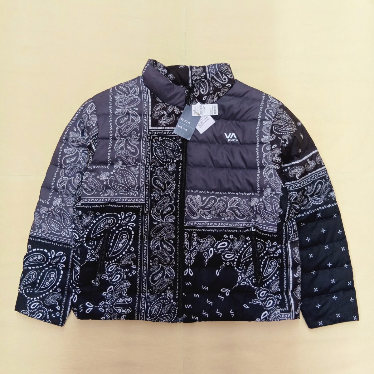 軽量なナイロン素材を使用し、使い勝手のよいジップアップタイプのダウンジャケット。左胸にVAロゴがプリントで施されています。バンダナ柄を巧みに組み合わせたオールオーバーパターンと、無地のプレーンタイプで登場。両ウエストにはファスナーポケットが付く。