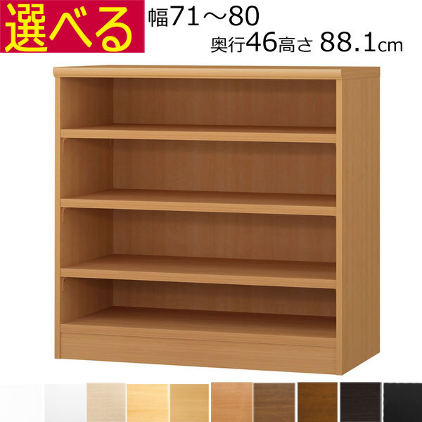 【特徴】幅15~70cm(棚板厚み1.7cm)(棚板厚み2.5cmは~幅90cm)まで1cm単位でオーダーメイド、本棚です。高さ49・60・70・80・88・117・135・150・178・211cm、奥行きは19・25・31・40・46cm、カラーは12色。【本体外寸】幅71~80×奥行き46×高さ88.1cm(約)【棚板枚数】3枚【幅の内寸】全体の幅サイズから3.6cmを引いた寸法となります。※側板(縦の両脇の板)の厚みは1.7cm棚は移動可能で穴から穴までの高さ(ピッチ)は3cm【色・主材】12色・プリント紙化粧繊維板【生産国 】JAPAN※お客様組み立て商品です。(組み立て家具です)【お詫び】特注のため、お届けまで10~14日かかります。送料込ですが、北海道・沖縄・離島は別途送料がかかります。【井崎店長から一言】特別注文のため、ご注文後のサイズの変更、お取り消しがお受けすることが出来ません。サイズの確認を十分にお願いいたします。【お支払い方法について】>申し訳ございませんが、代金引換以外をお選びください。プラス・マイナスドライバーで組み立てられます。