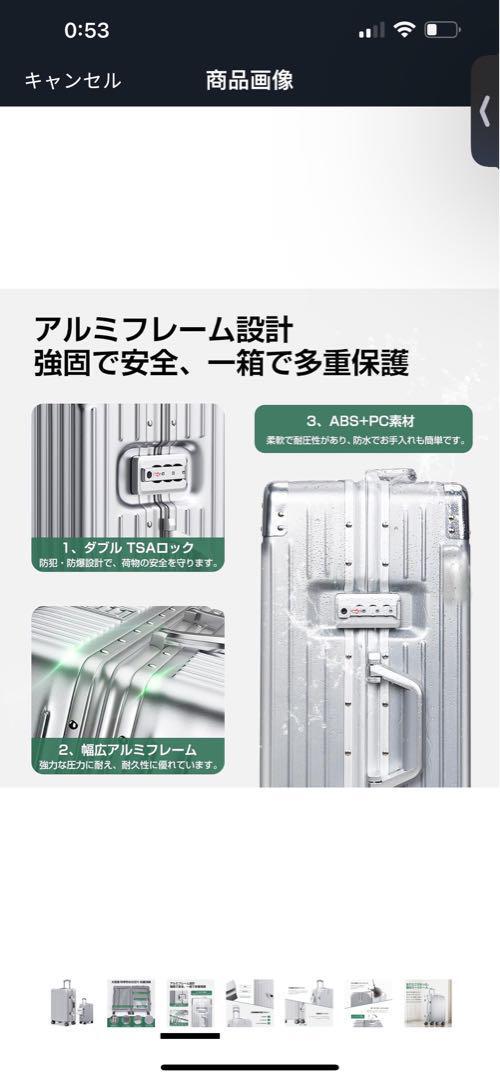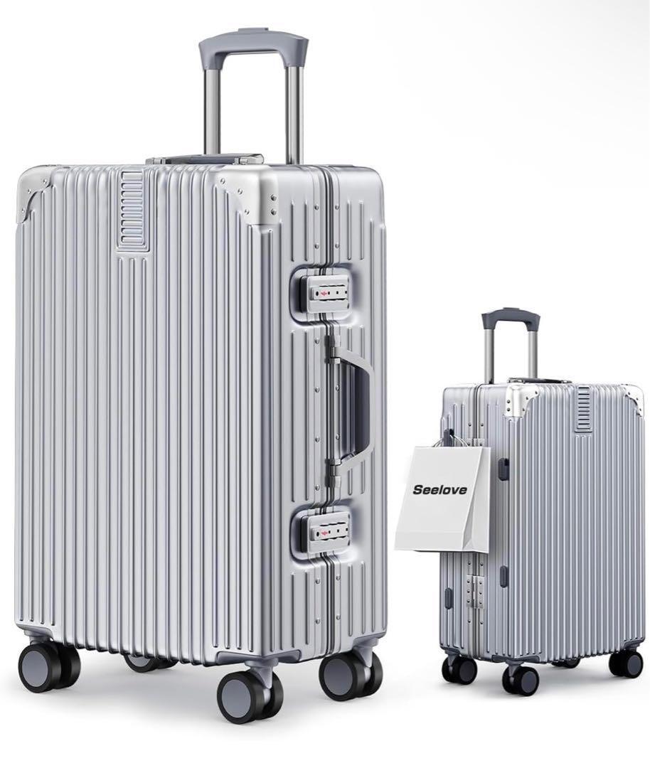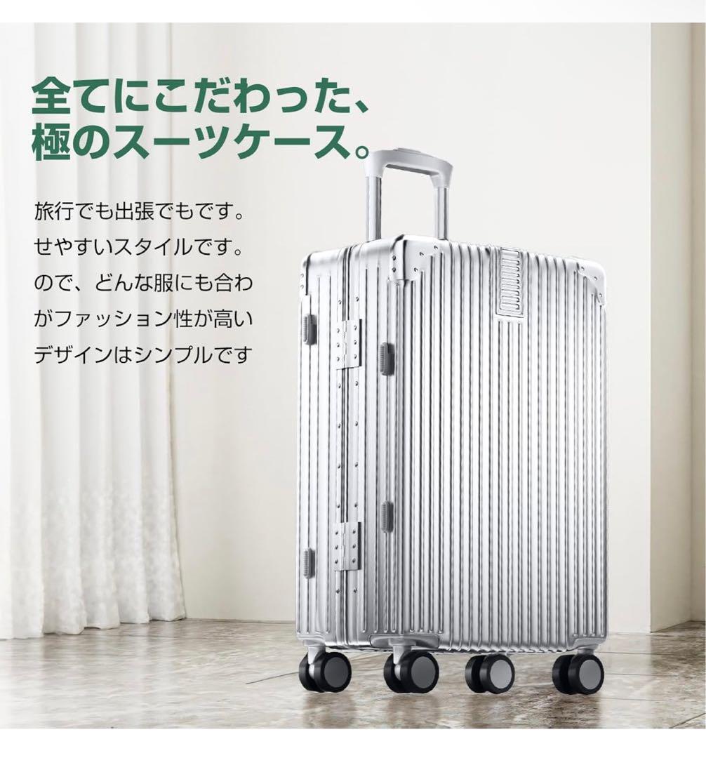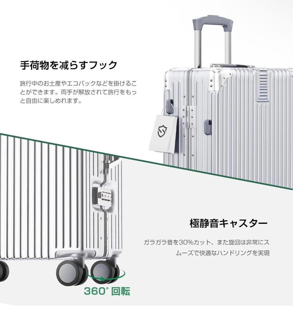 【高品質アルミフレーム&360°静音キャスター】 このスーツケースは、軽量で耐裂性のあるABS樹脂と衝撃に強いPC樹脂を組み合わせた素材に、幅広のアルミフレームデザインを採用し、頑丈で耐久性のあるハードシェルを実現しました。輸送時の衝撃にも強く、安心して使用できます。また、箱体は防水・防汚加工が施されており、雨の日でも安心してお使いいただけます。特別に設計された消音キャスターは、通常のキャスターより約30%音を軽減し、360°スムーズに回転するため、混雑した空港や駅でも快適に移動できます。ビジネス出張での急いでいる時や、家族旅行の荷物を運ぶ際にも、静かで快適な移動体験を提供します。