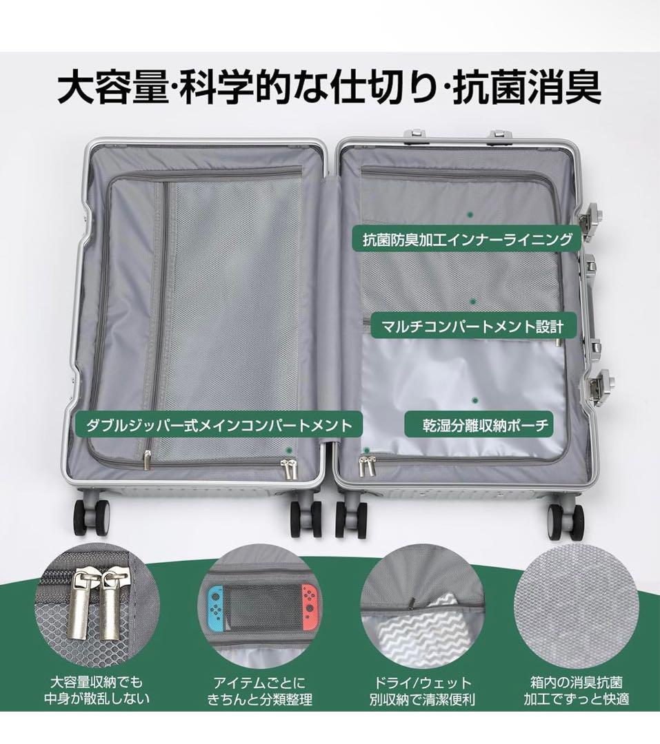 【大容量&収納システム&抗菌防臭設計】 こちらのMサイズスーツケース(66×43×25cm)は、革新的な収納システムを採用し、大容量と整理整頓を両立。2つのメインコンパートメントには両開きの防爆ファスナーを装備し、5~7着の衣類をきれいに収納しながら、中身の散乱を防止。2つの透明メッシュポケットでパスポートや充電器などの小物を分類収納可能。防水のウェット&ドライポケットは、水着や濡れたタオルなどを清潔な衣類と完全に分離し