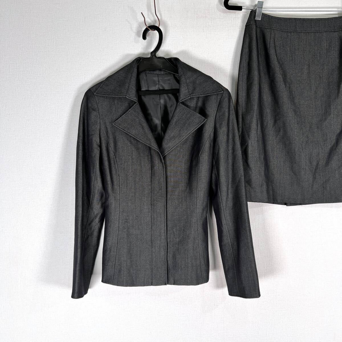 女性用のダークグレー系3点セット スーツ セットアップ 上下セット ビジネススーツです。中古品ですが目立つ傷や汚れもなく、まだまだ使えます。古着 ASPRI