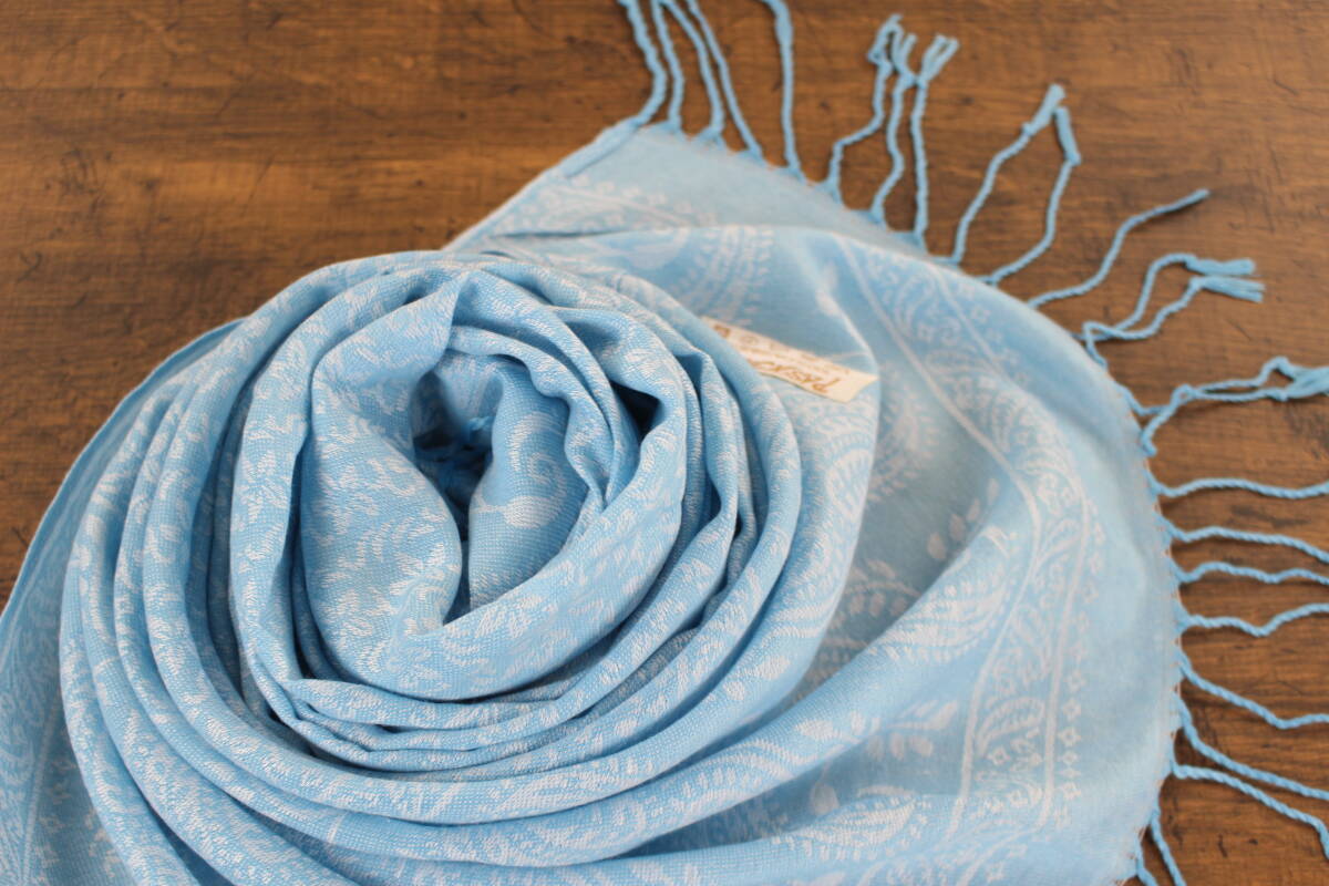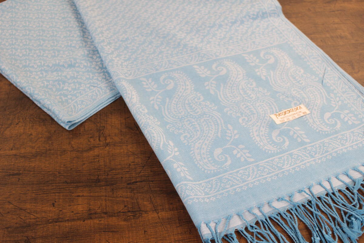 新品【パシュミナ Pashmina】ペイズリー×小花柄 ライトブルー 青 L.BLUE 大判 ストール カシミア100% Cashmere