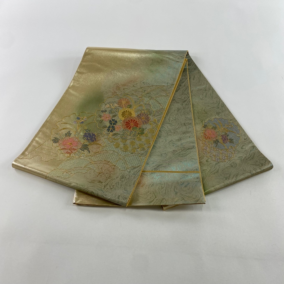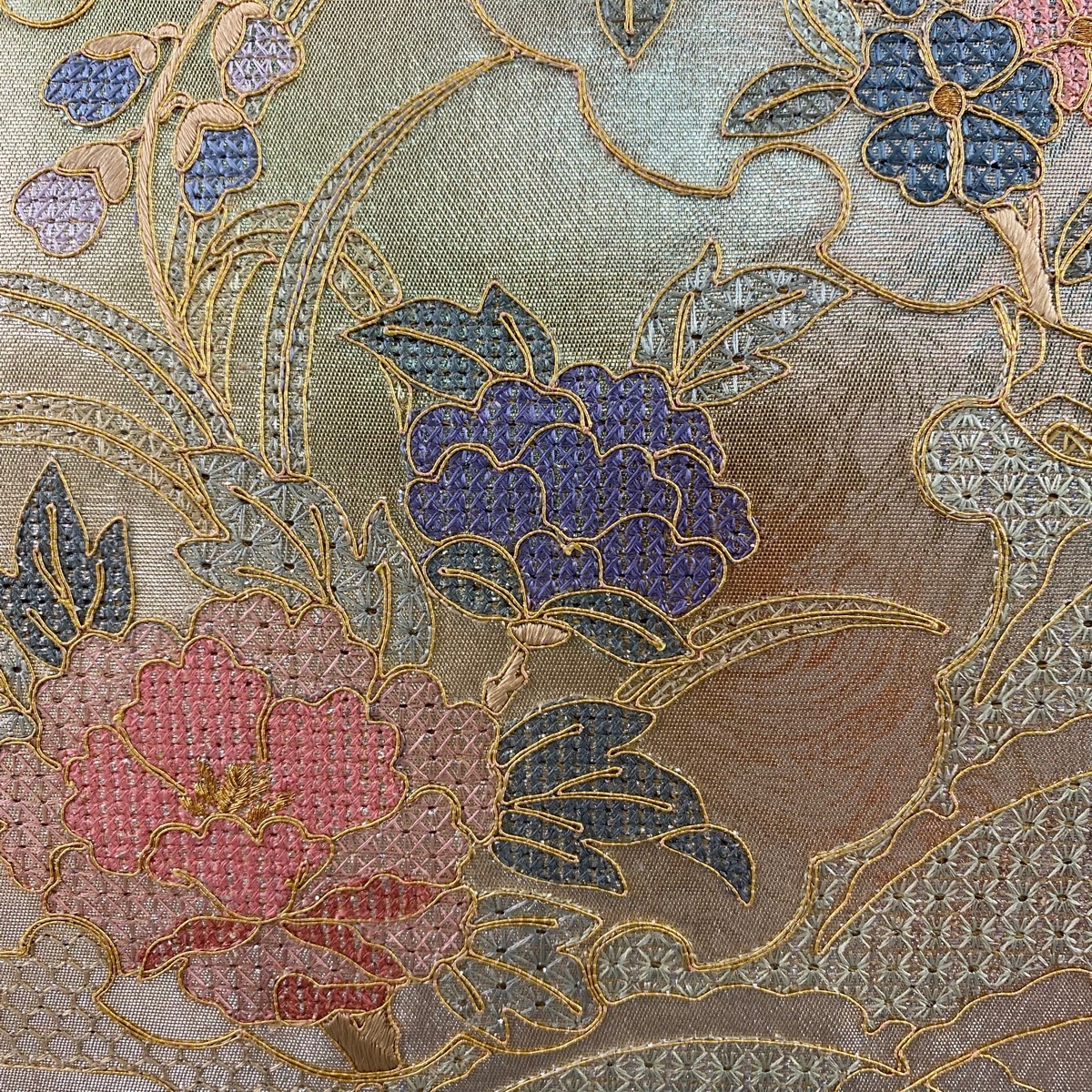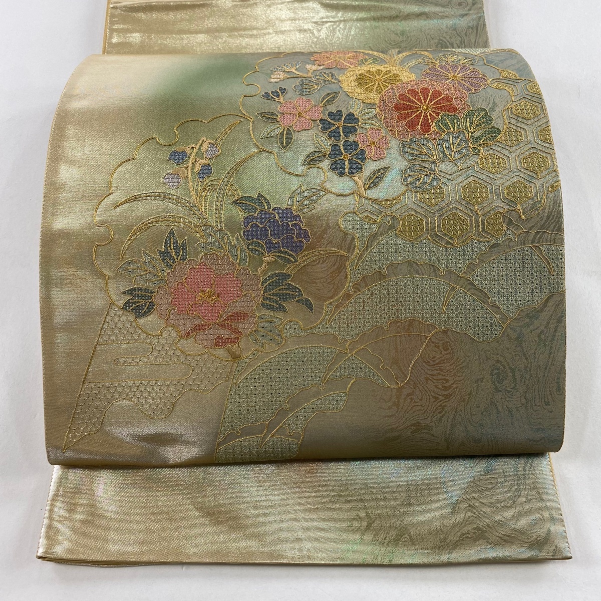 | 袋帯 美品 秀品 雪輪 草花 金糸 刺繍 金色 お太鼓柄 正絹 【中古】 |