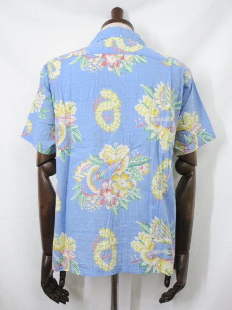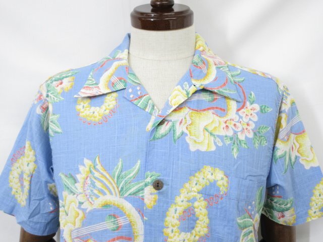 超美品【サンサーフ】東洋エンタープライズ 麻混 SS38408 MACINTOSH UKULELE プリント柄 半袖 アロハシャツ(メンズ)M ブルー系◇17MK6261◇