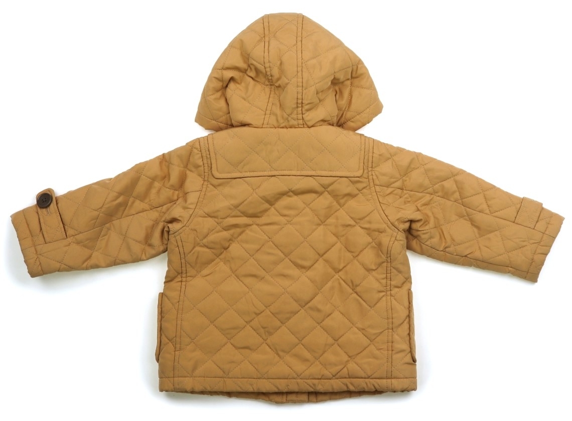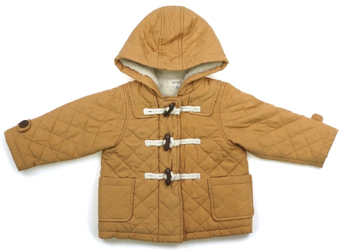 表地はポリエステルで、ボアの裏地付き。フードは縫い付けです。トグルはフェイクで、前ファスナー開き。所々にステッチのほつれあり。全体に薄汚れがありますが、普段使いにいかがでしょうか。