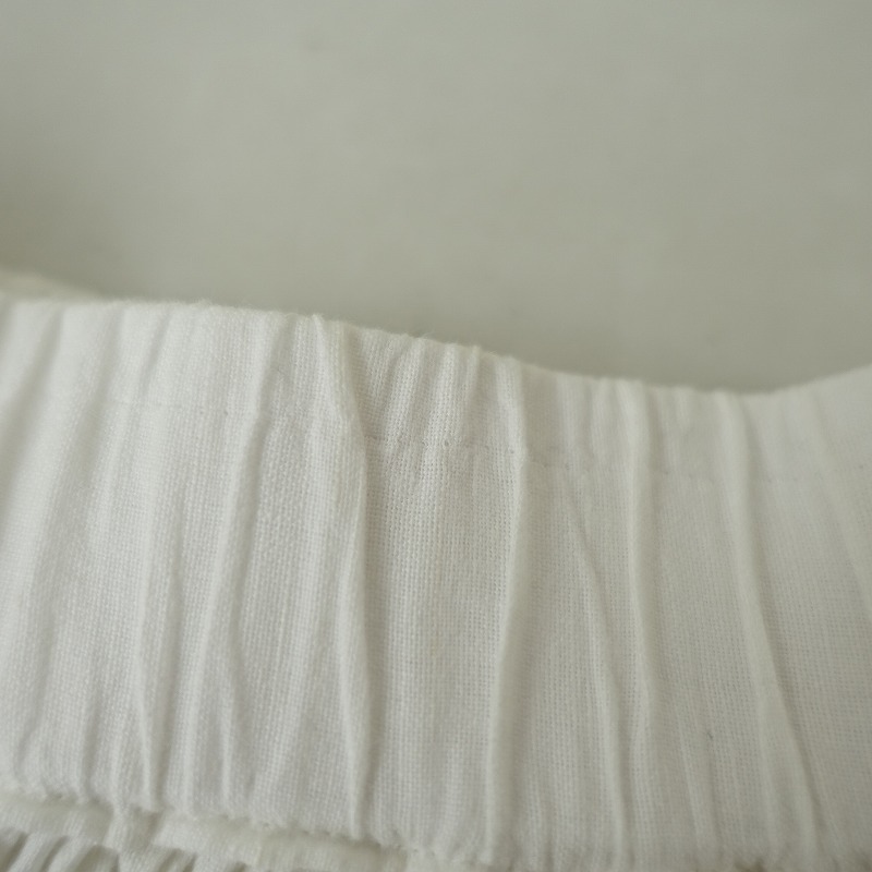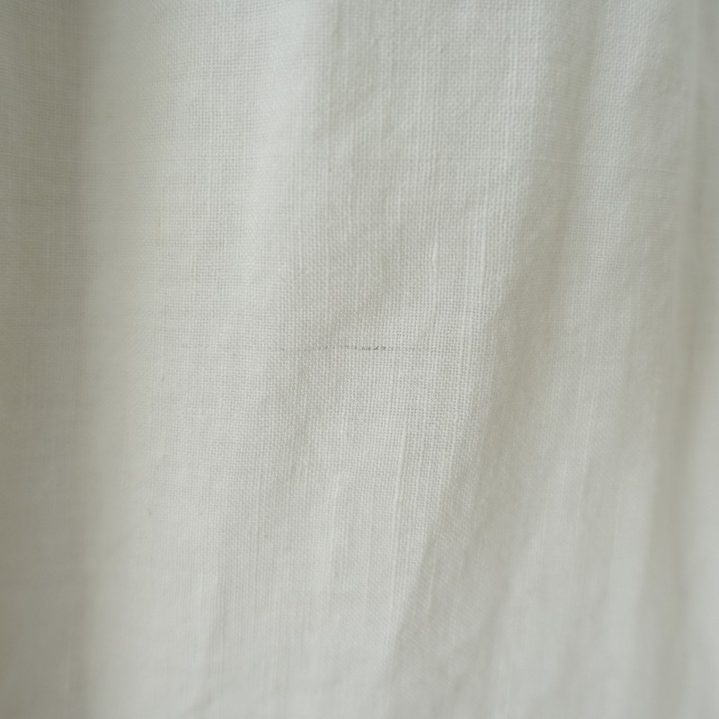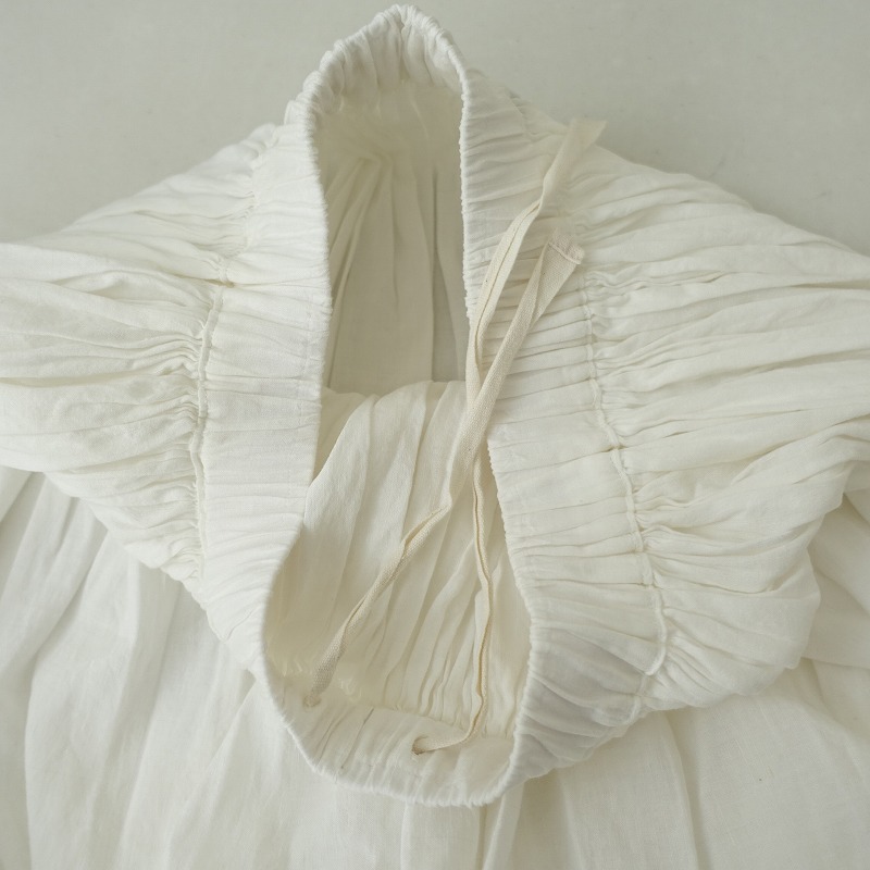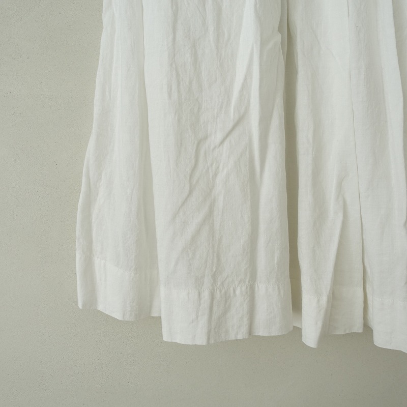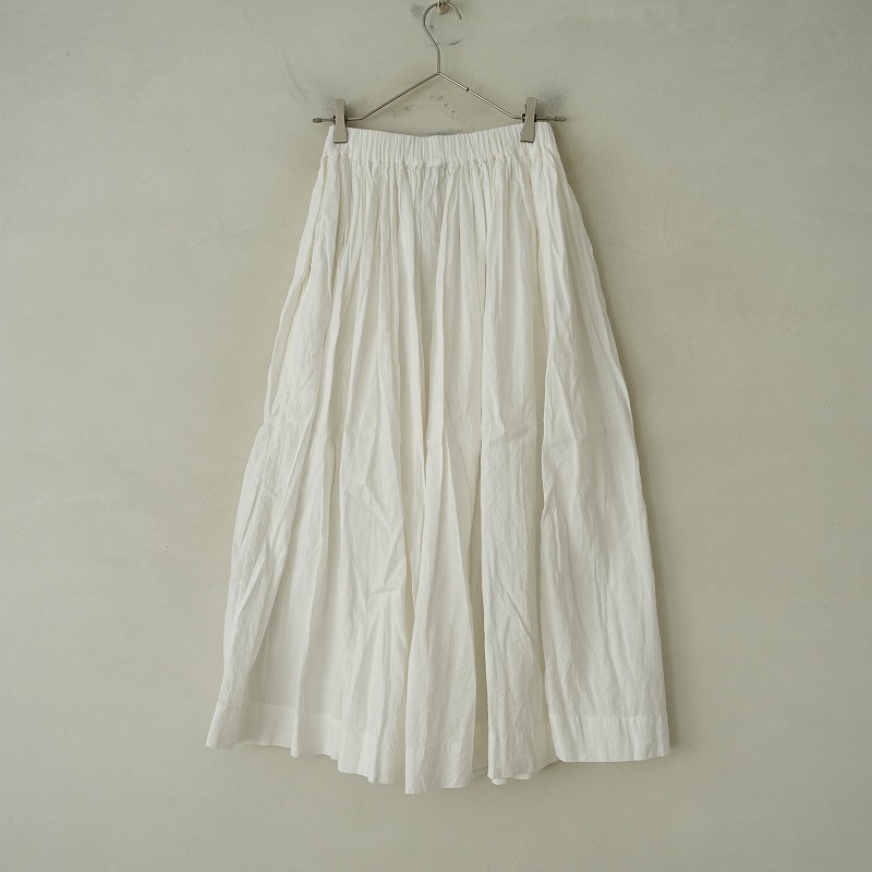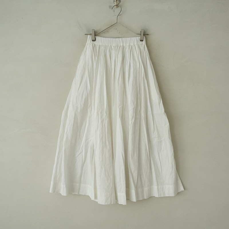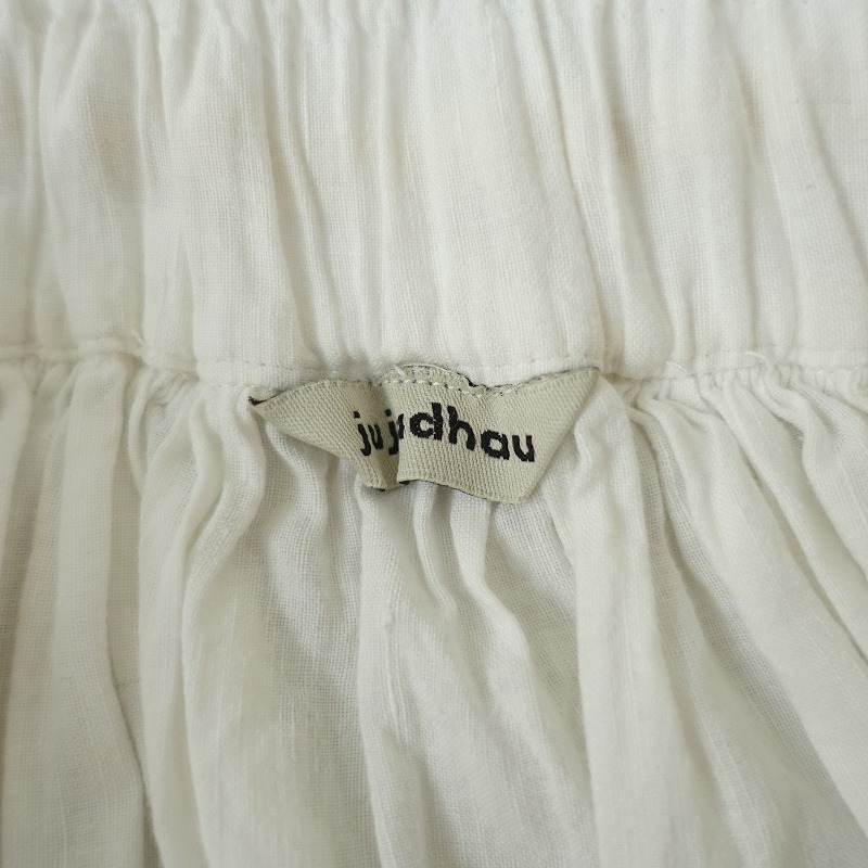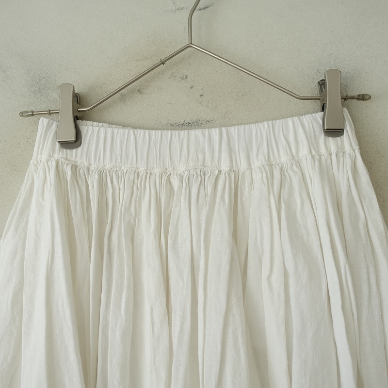 jujudhauのコットンリネンギャザースカートです。カラーはホワイトで、コットン×リネン混紡の織節のある薄手の布帛地です。腰周りにギャザー入りのフレアデザインで、ウエスト総ゴム&紐入りです。腰両サイドにシームポケットがあり、裏地は付いておりません。 |