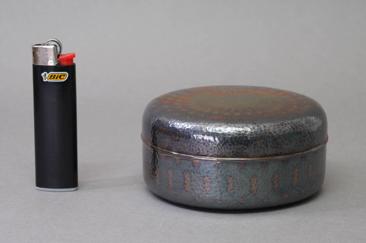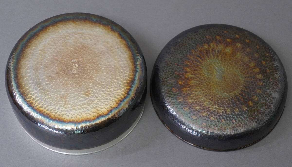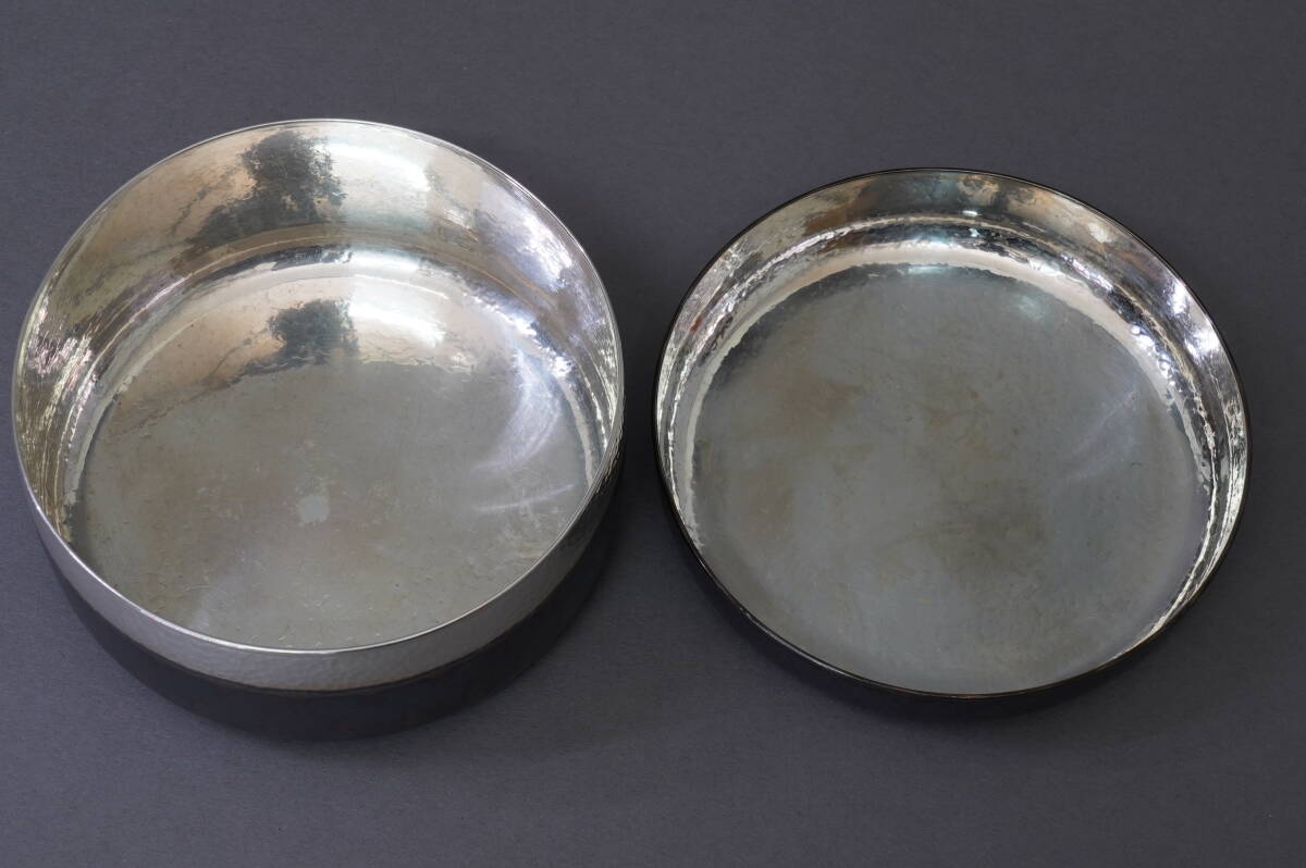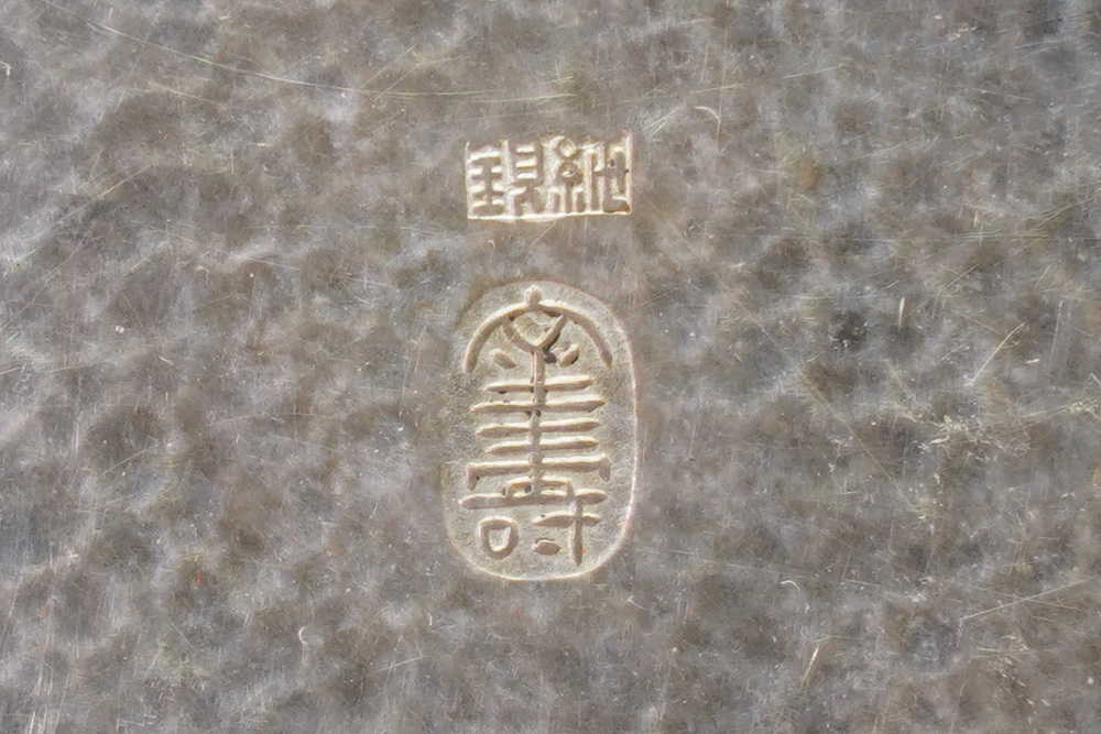 非常に希少な金寿堂造 純銀菓子器 (共箱付) です。 細かな鎚目の美しい菓子器で、底に「純銀」「金寿堂」の刻印有り サイズ(約):直径9.2cm 高さ4.2cm 重量:97g この機会に是非! |
