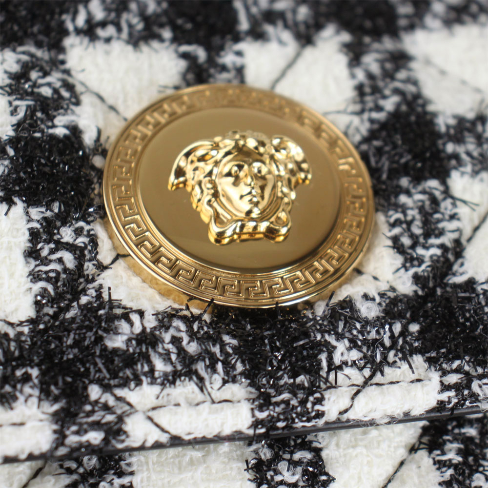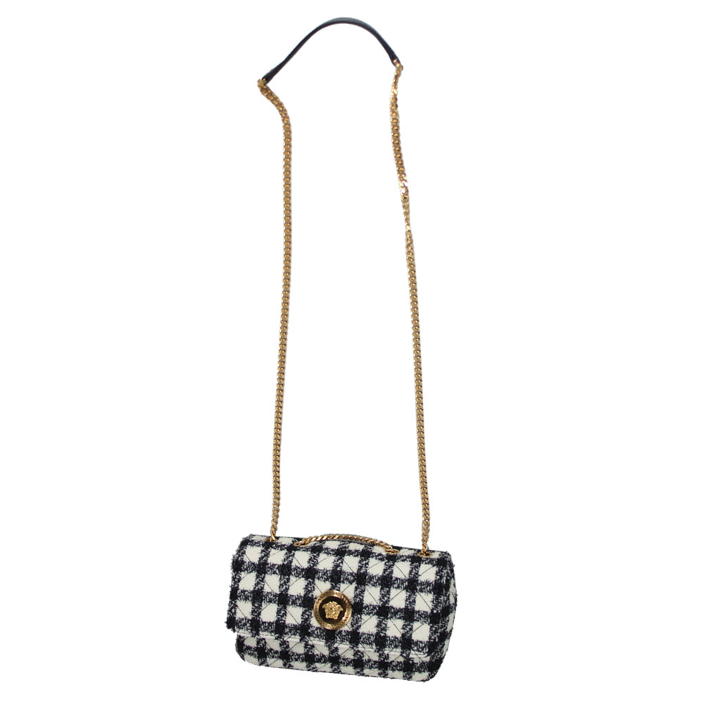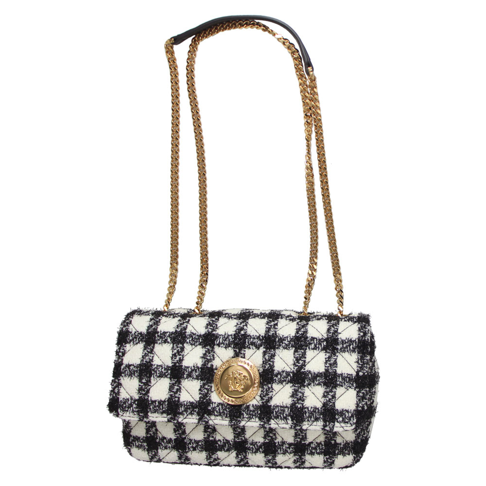 ブランドの象徴的なメドゥーサ金具が印象的なヴェルサーチのチェーンショルダーバッグです。 ツイード素材でレザーとは一味違う気品漂う存在感に仕上がっております。 チェーンはループ式になっているので、ダブルにしてセミショルダー、シングルにしてクロスボディバッグと、コーディネートに合わせたスタイリングをお楽しみいただけるアイテムです。 | |