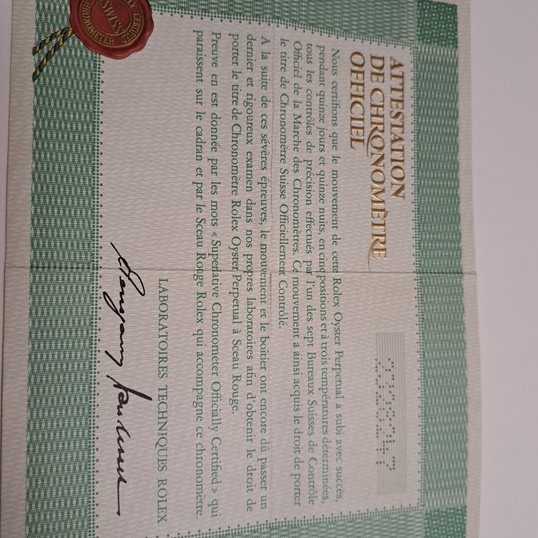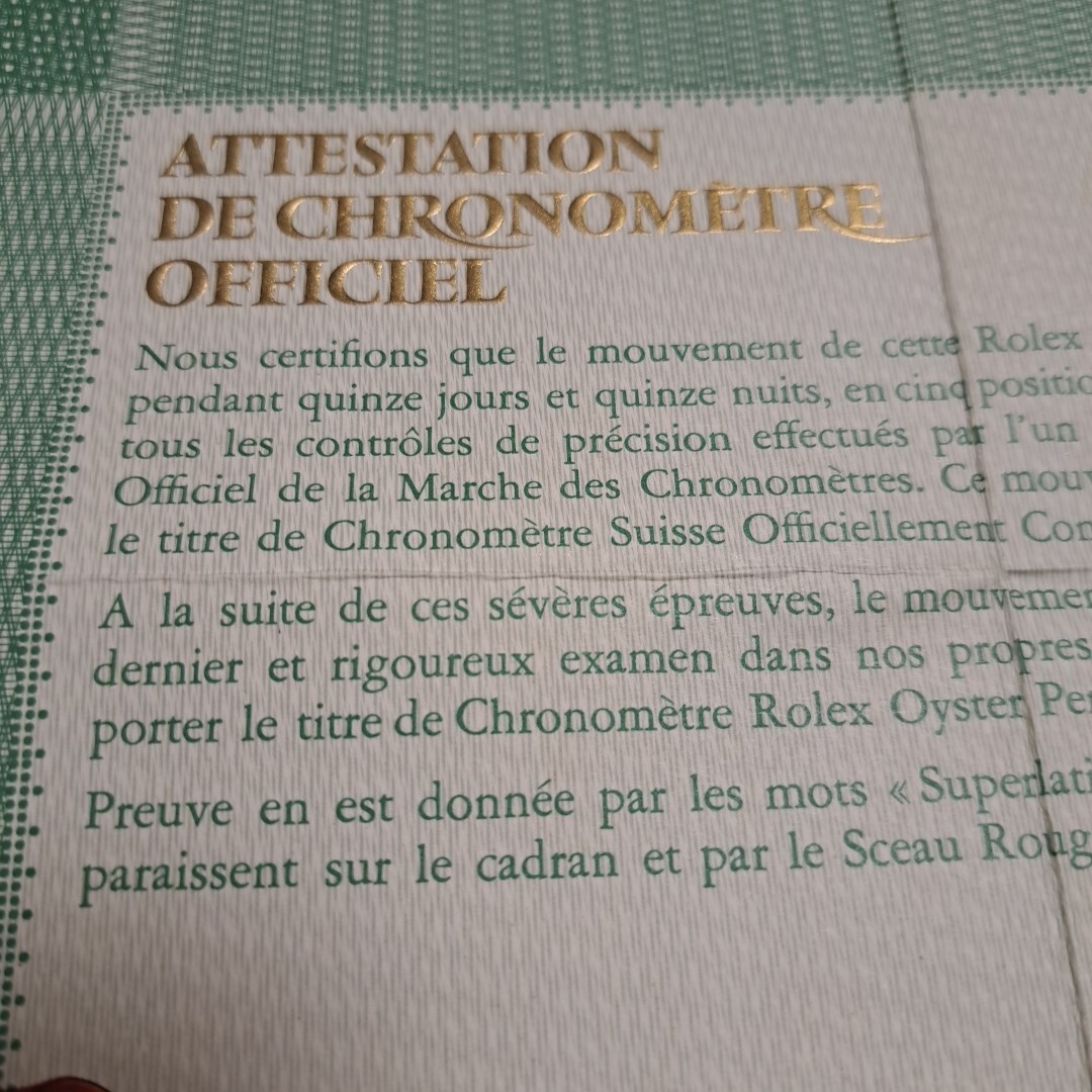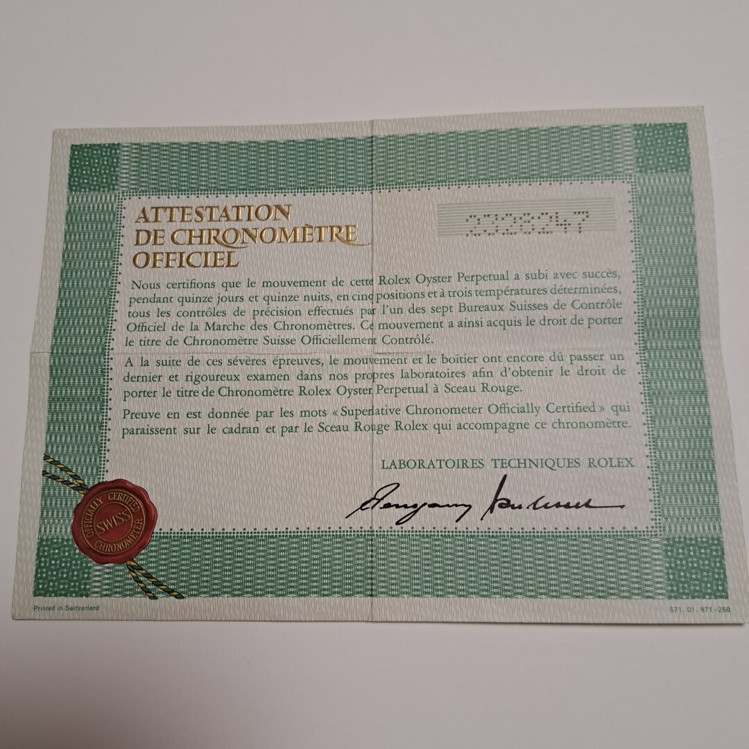 ROLEX(ロレックス)の ATTESTATION DE CHRONOMEETRE OFFICECIEL(公式クロノメーター証明書)です