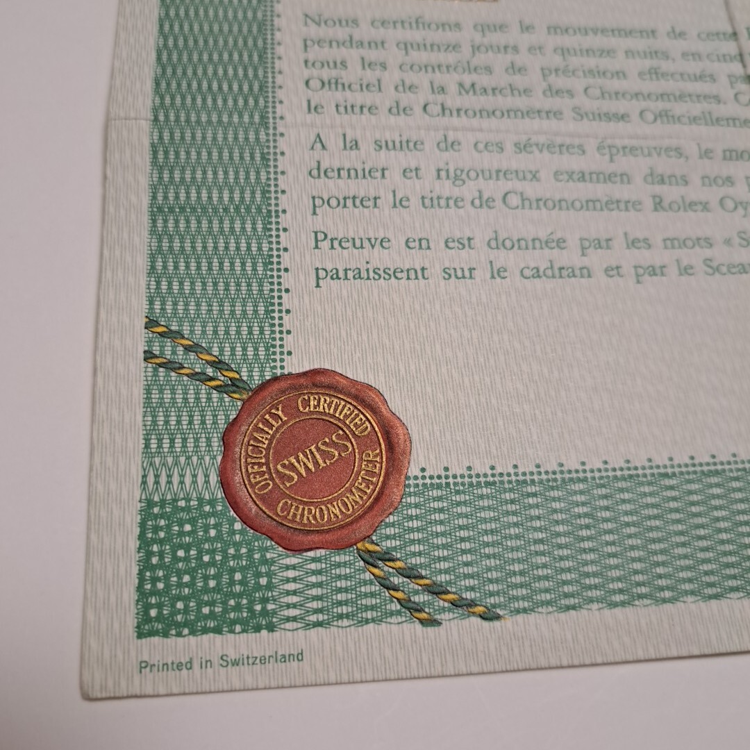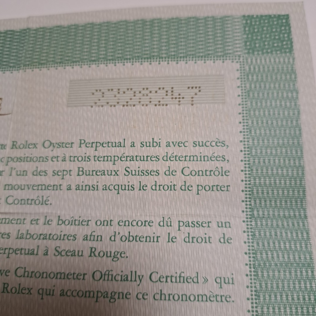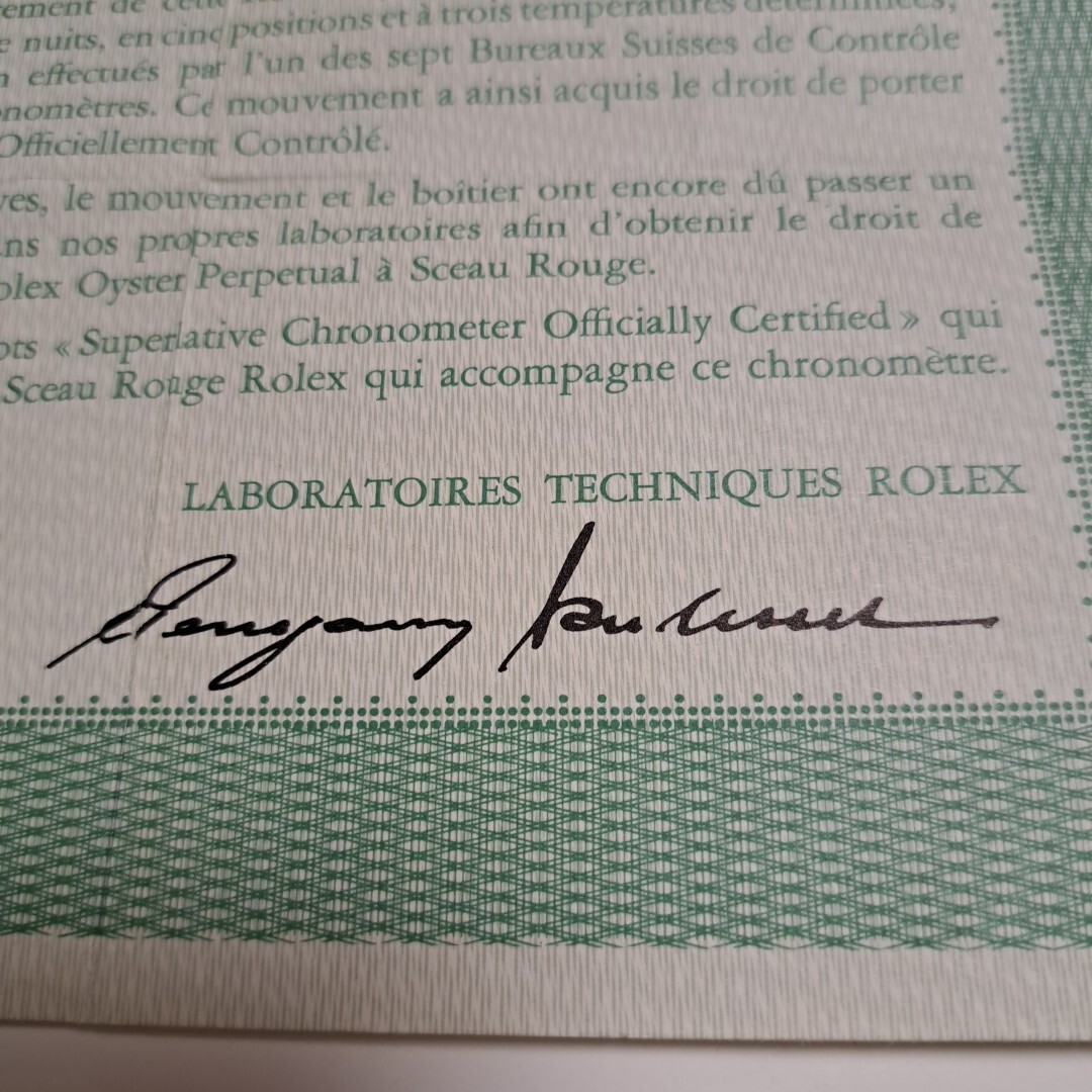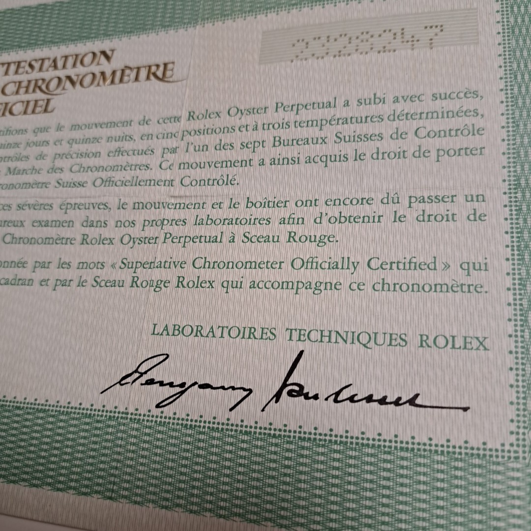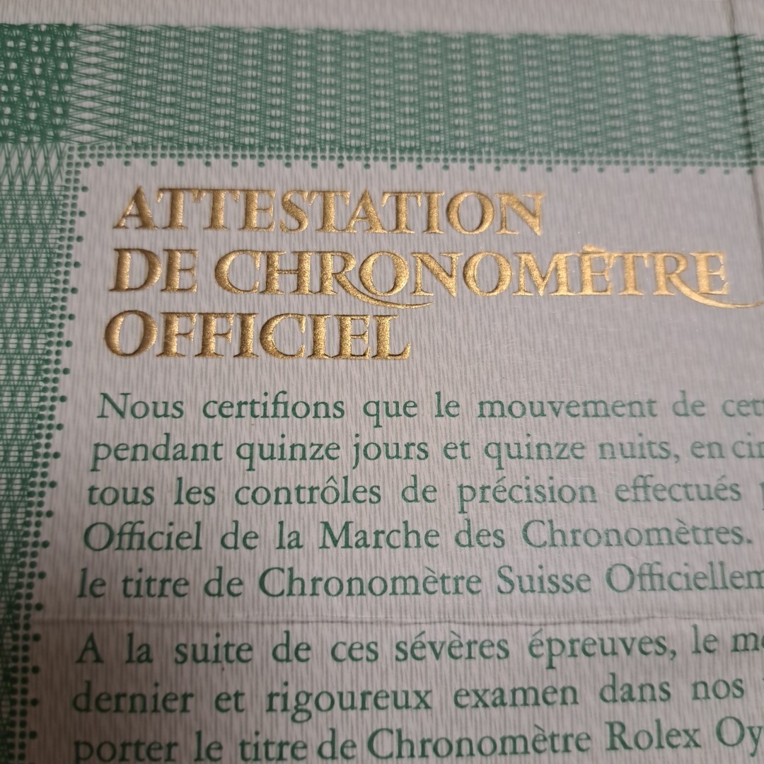 Nous certifions que mouvement de cette Rolex Oyster Perpetual a subi avec succes, pendant quinze et quinze nuits,en cinqpositions et a trois temperatures determinees, ~