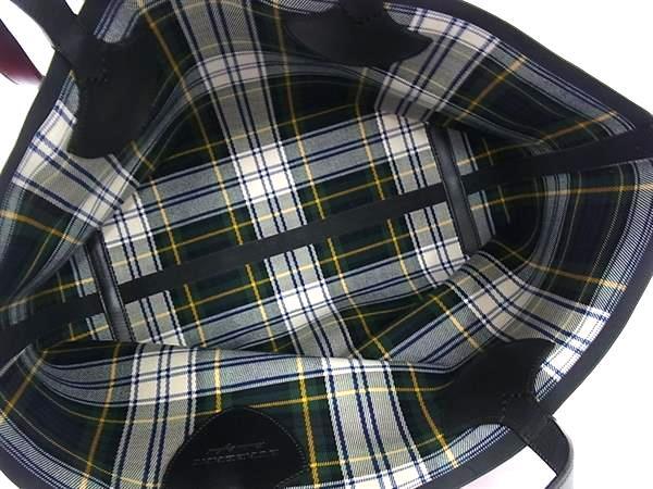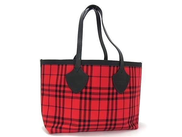 1円 ■美品■ BURBERRY バーバリー リバーシブル キャンバス×レザー チェック柄トート ショルダーバッグ レッド系×ブラック系 FR5417