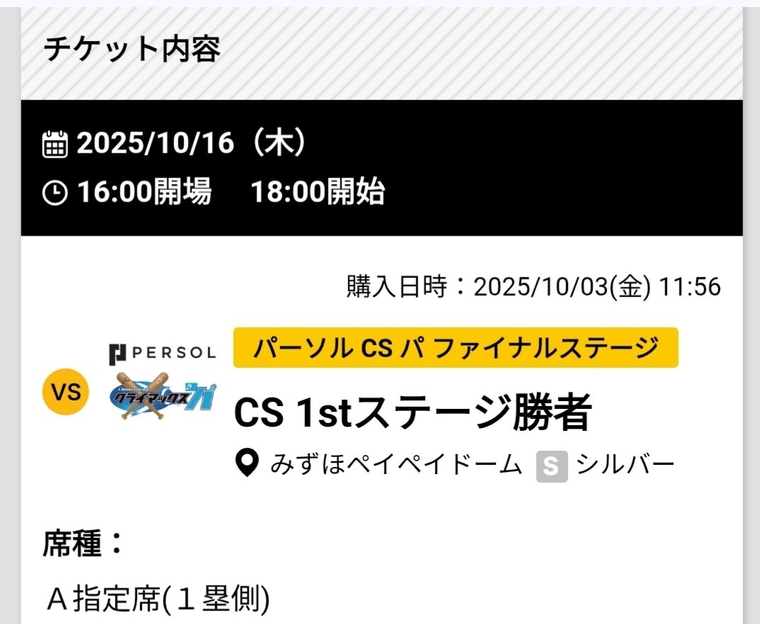 2025年10月16日(木)開催のパーソルCS パ・ファイナルステージのチケットです。
