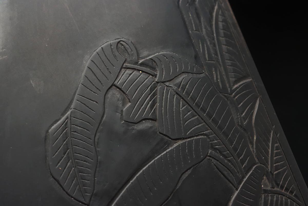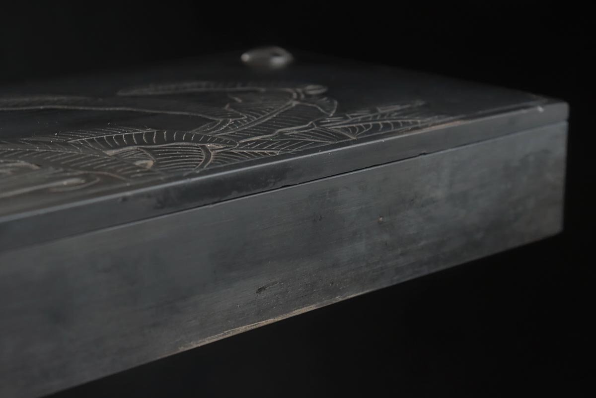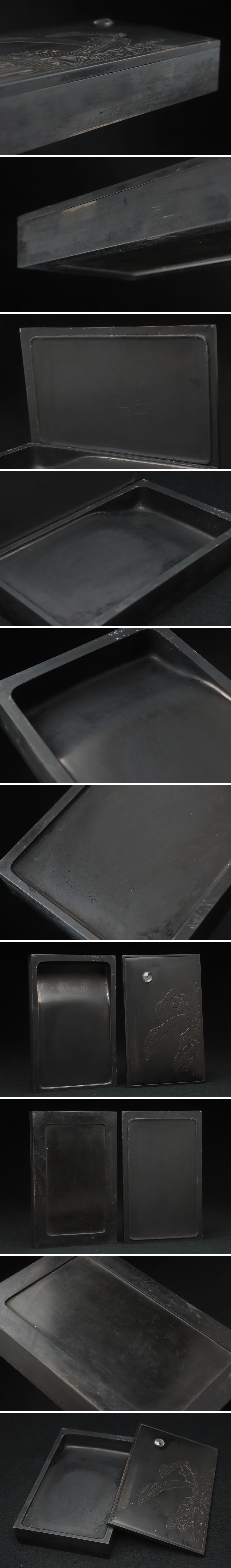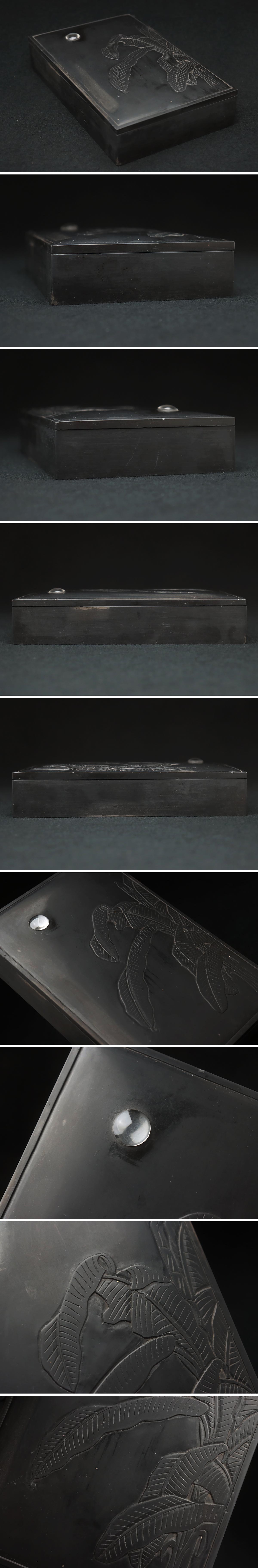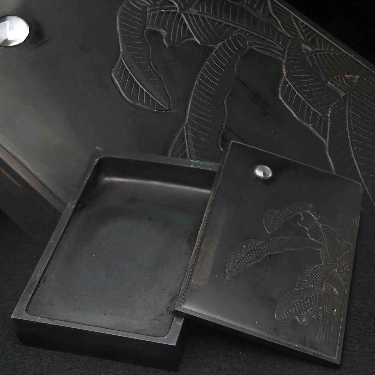 ◆ 書道具 黒石 ガラス玉象嵌 芭蕉彫図 蓋付硯 縦16.6cm・古硯・書道硯・長方硯 書画道具 文房四宝 ◆