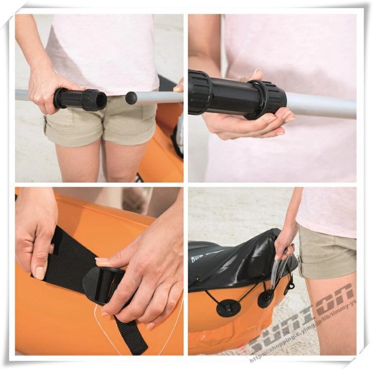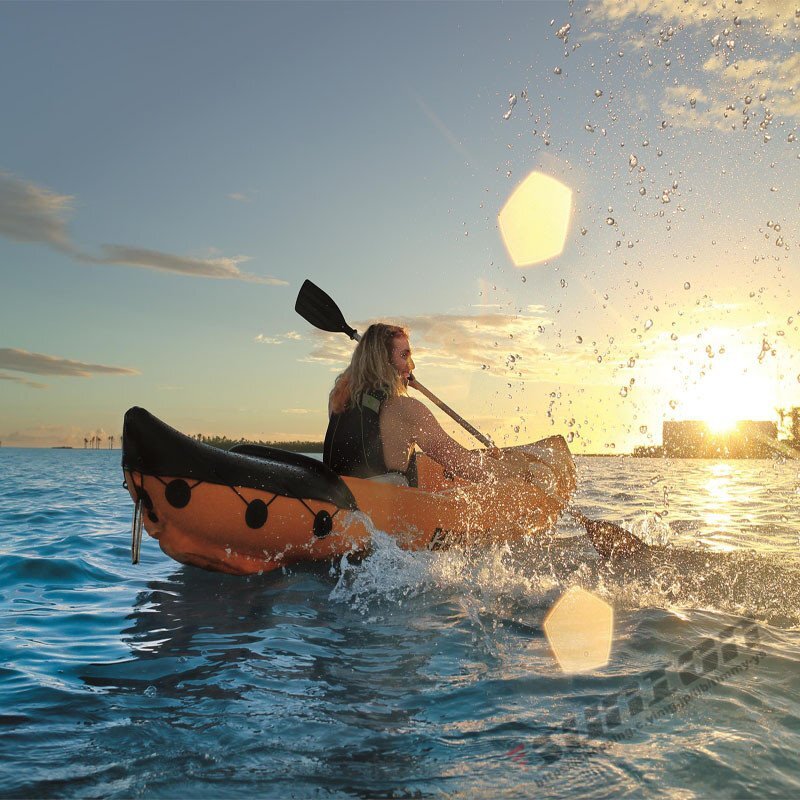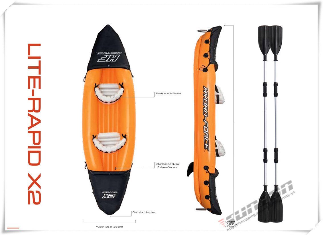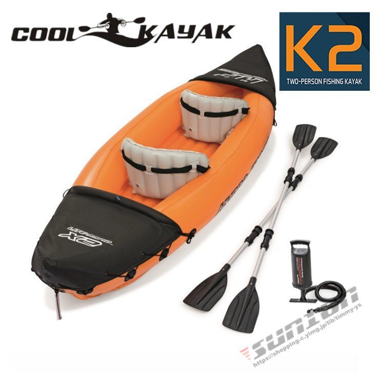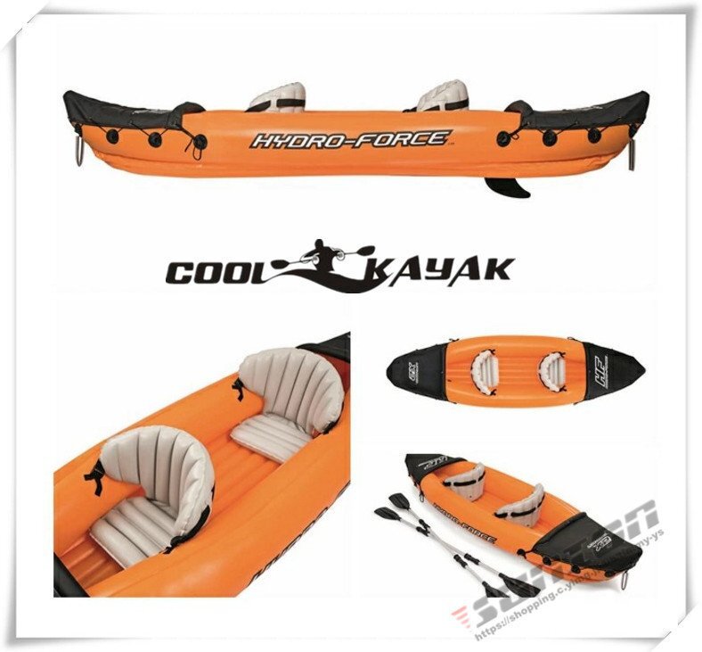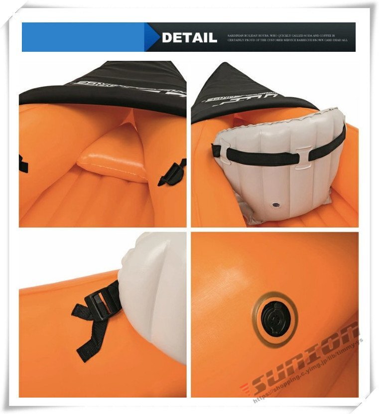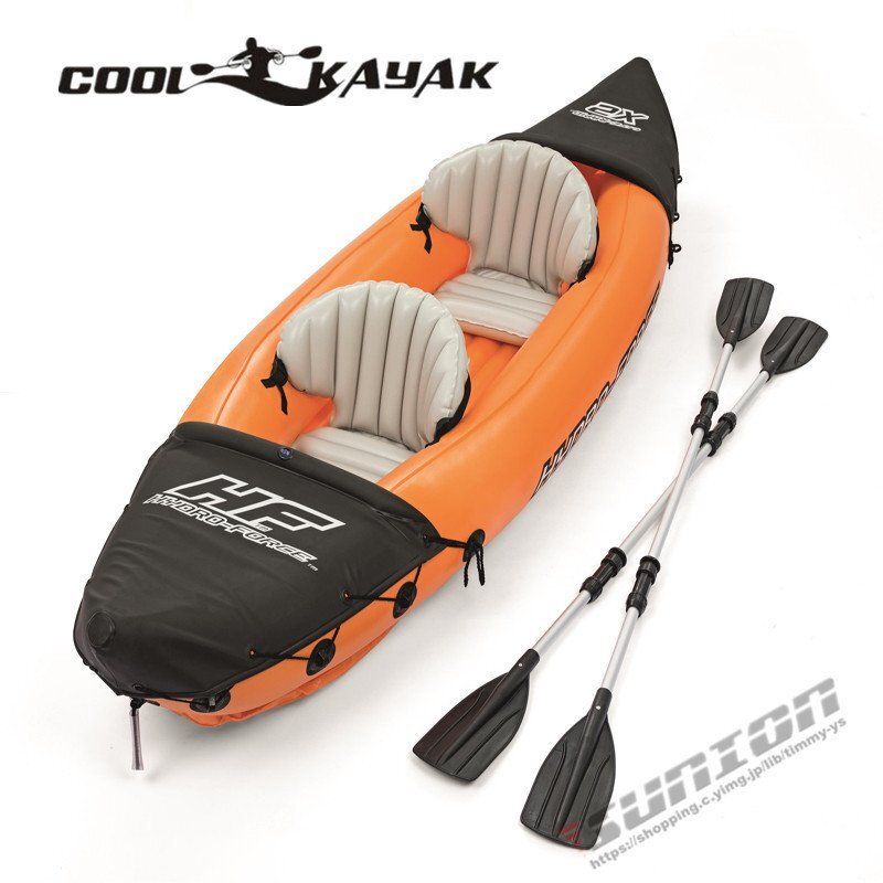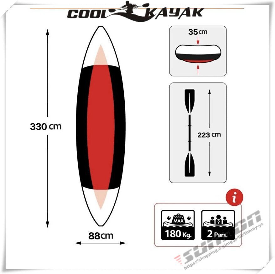 【商品SPEC】■サイズ:約321×76cm■重量:13.8kg■素材:0.57厚耐久性pvc■適応体重:160kgまで■包装サイズ:約60×35×42cm■セット内容:本体、手動ポンプ、パドル×2●持ち運びや保管に便利な、2人乗りインフレータブル式カヤック。●カヤック本体とイスを膨らませて取り付けるだけの初心者に最適な簡単構造。●角度の調節できるインフレータブルシートにより数時間のパドリングも楽々。●フロアに設置されたドレンバルブにて船体に入った水を排出し、最適な量に調節することが可能です。