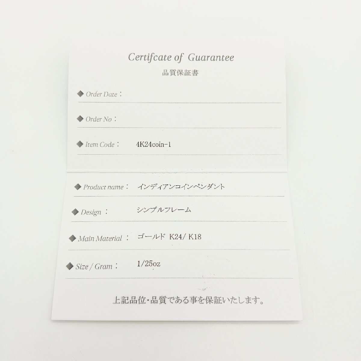 1158♭SPERANZA/スペランツァ K24 コインペンダント 純金 刻印入り インディアン イーグル シンプルデザイン 1/25oz 品質保証書付【0513】