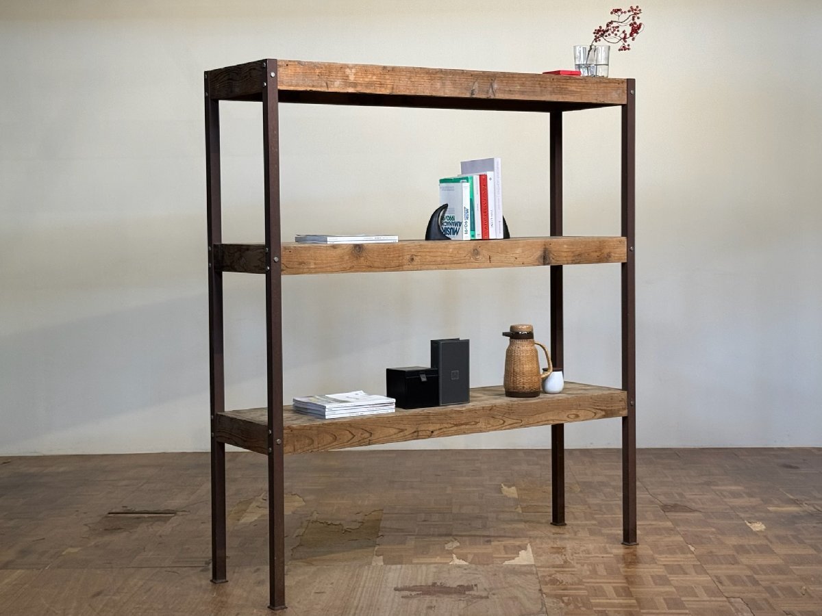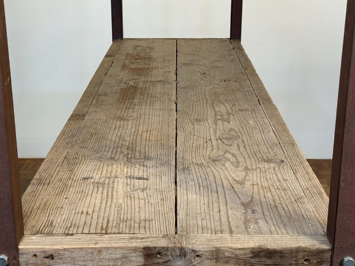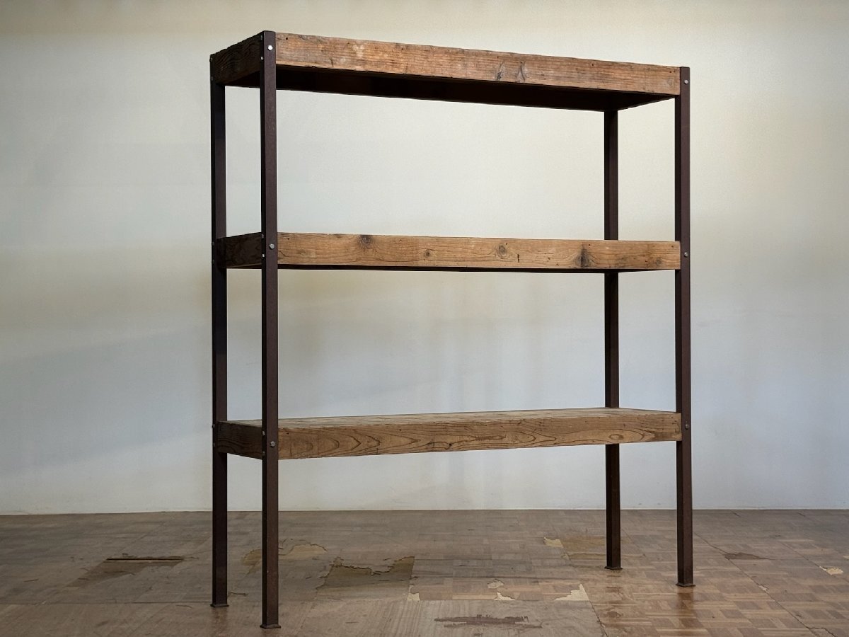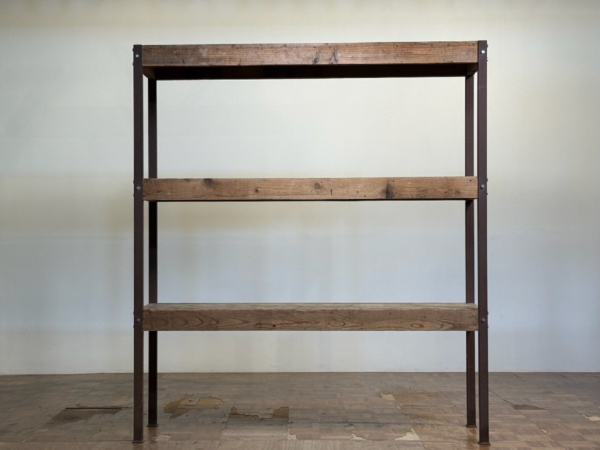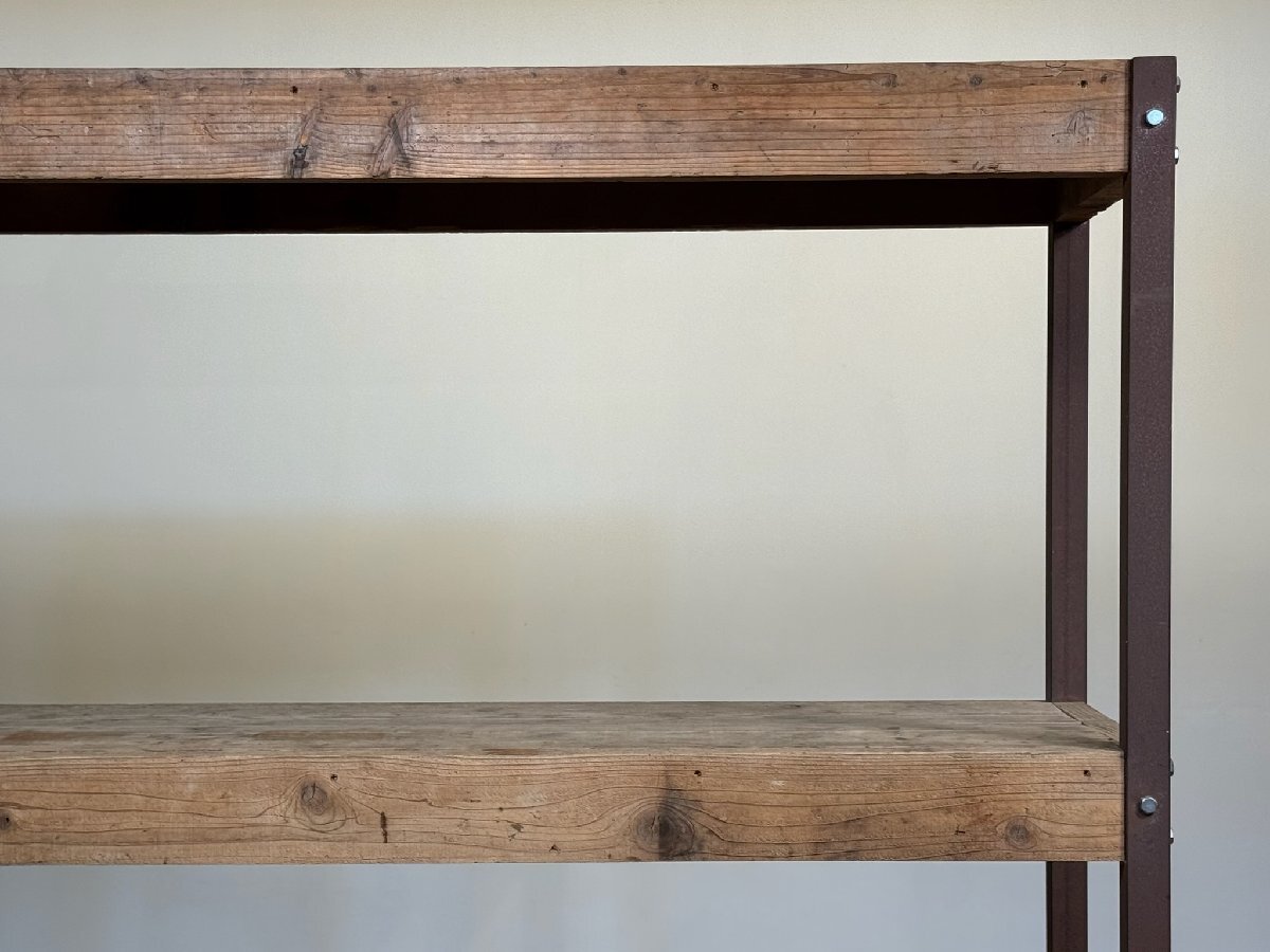 少なくとも半世紀単位のエイジングを帯びた荒々しい古材のテクスチャーに仕上がった無垢材とエンジ色のような赤みをもったブラウンカラーのスチールフレームが、単調なデザインに生き生きとした表情を与えている フレンチヴィンテージオープンシェルフラック。推定1960~70sヴィンテージ品。