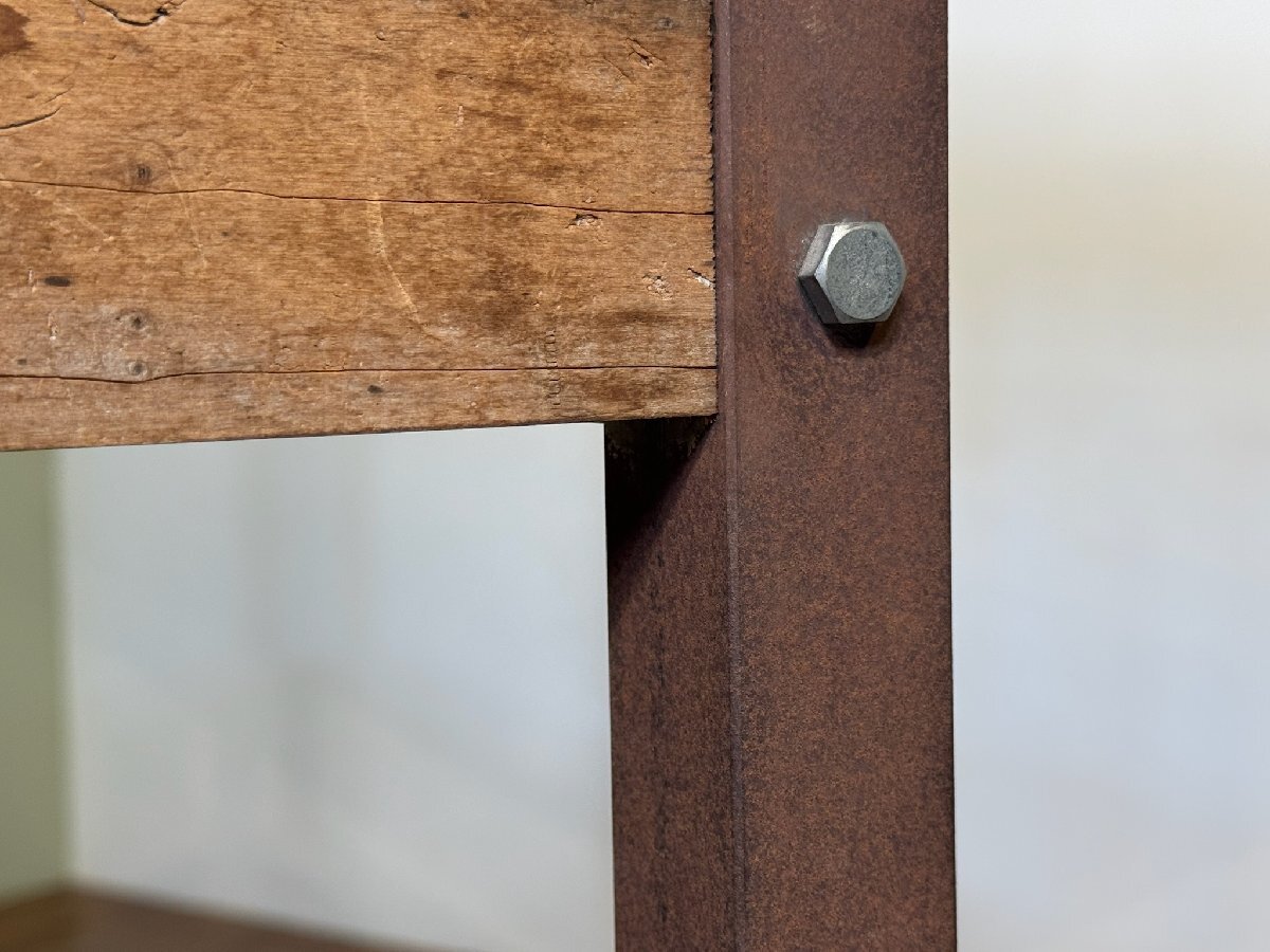 スチールと古材を仕様したシンプルなデザインに、雄々しく重厚感のあるサイジングとびっしりと描かれた経年に伴うエイジングのパティナが希少な逸品です。
