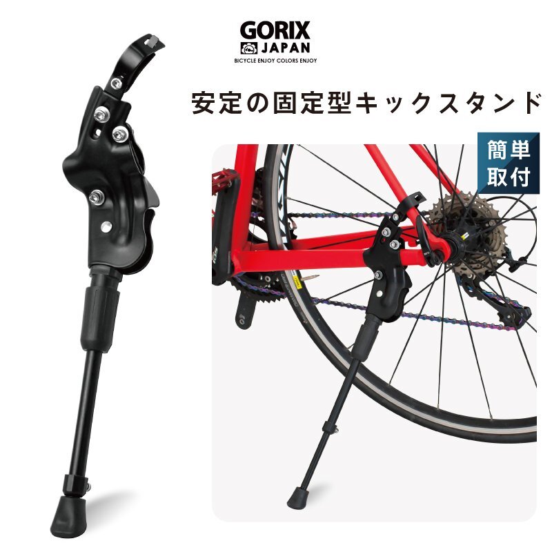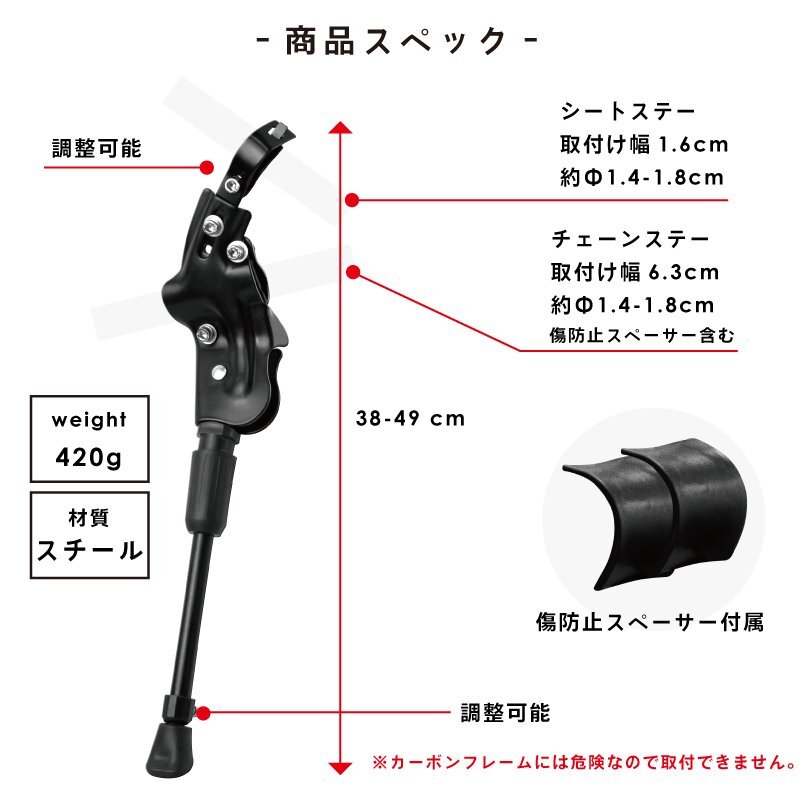 一度取り付ければ取り外し不用 足先だけで簡単に操作ができる安定型キックスタンドです。 ・ロードバイク、マウンテンバイク、クロスバイクに対応。 ・29インチの自転車に対応。 ・ステー同士の間隔はスライド調整できます。 シートステー側へ約3cm延長移動。 ・チェーンステーとシートステーの二箇所固定で 安定感があり、固定箇所への負担も軽減します。 ・キックしやすい高マンガン鋼のバネ素材 使用時・収納時でしっかりと止まり固定します。 サイズ:長さ38-49 cm (調整パーツ長さ21-32 cm) 対応幅:シートステー約Φ1.4-1.8 cm チェーンステー約Φ1.4-2.4 cm (スペーサー厚含む) 重量:420g 材質:スチール ジャンク品の為、正常に動作しない場合や修理が必要な場合等ある場合がございます。 キズ、汚れ、破損、使用感、付属品が足りない等ある場合がございます。ノークレーム、ノーリターン | |
