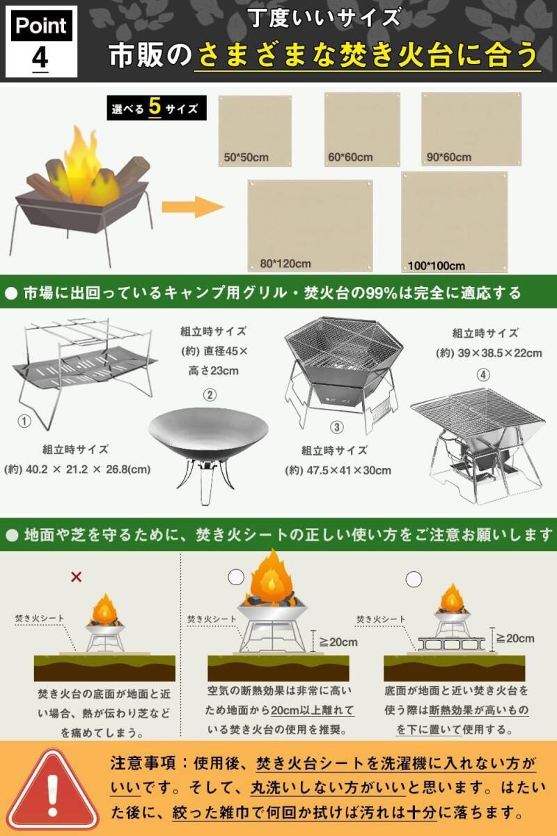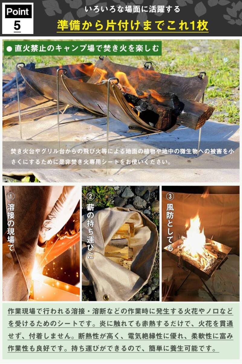 【地面を守る】使用寸法:90×60cm。2023改良モデル登場!縫い目には専用の防火線を採用し、耐熱性が従来比50%アップ。折りたたみ・運搬も楽々で、炭や薪の飛び散りによる地面ダメージをしっかり防ぎます。直火NGのキャンプ場でも安心!