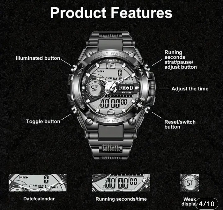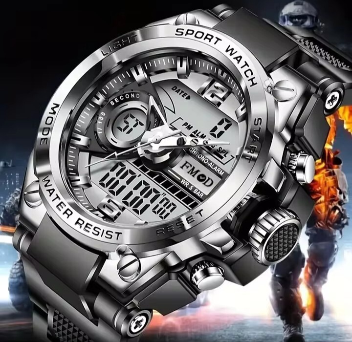 ストップウォッチ、耐衝撃性、LEDディスプレイ、自動日付、クロノグラフ、カレンダー、耐水性、アラーム