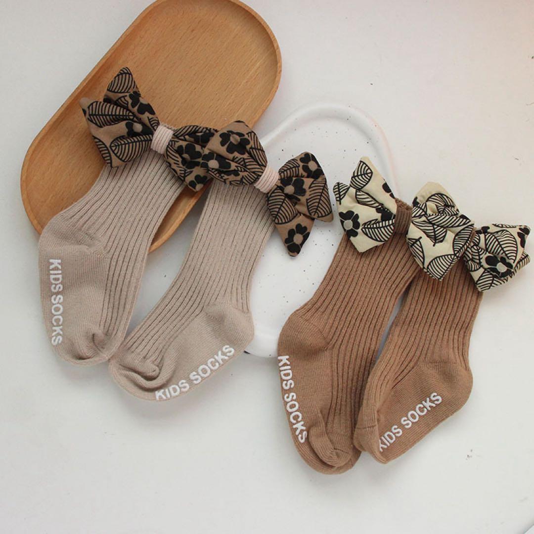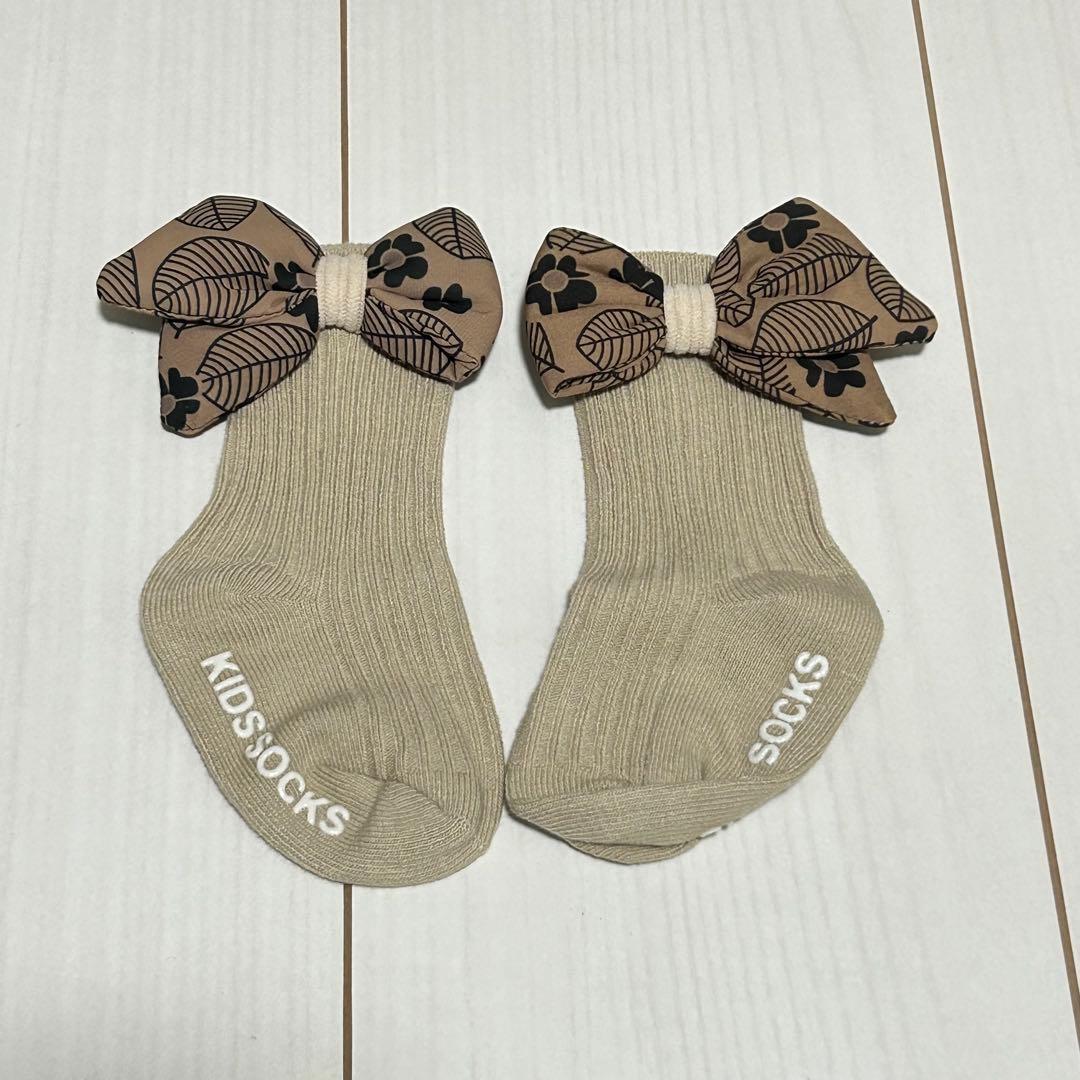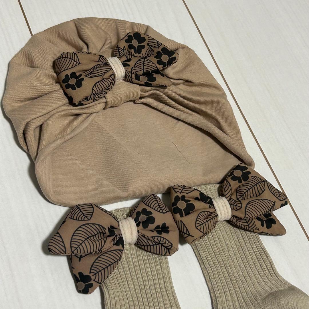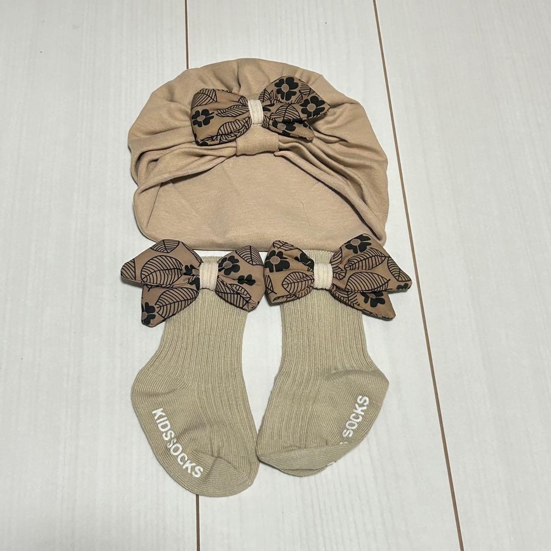 ベージュカラーのソックスとヘアバンドのセットです