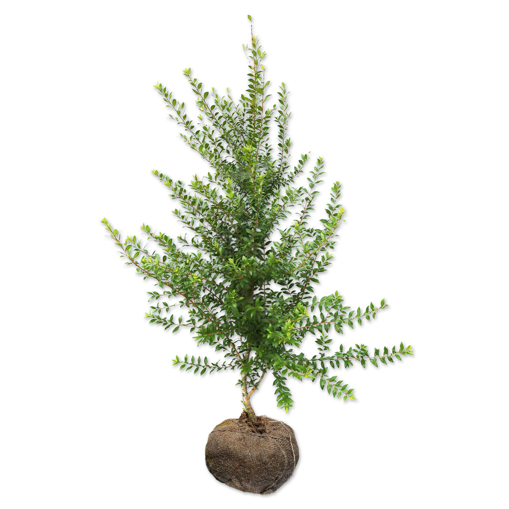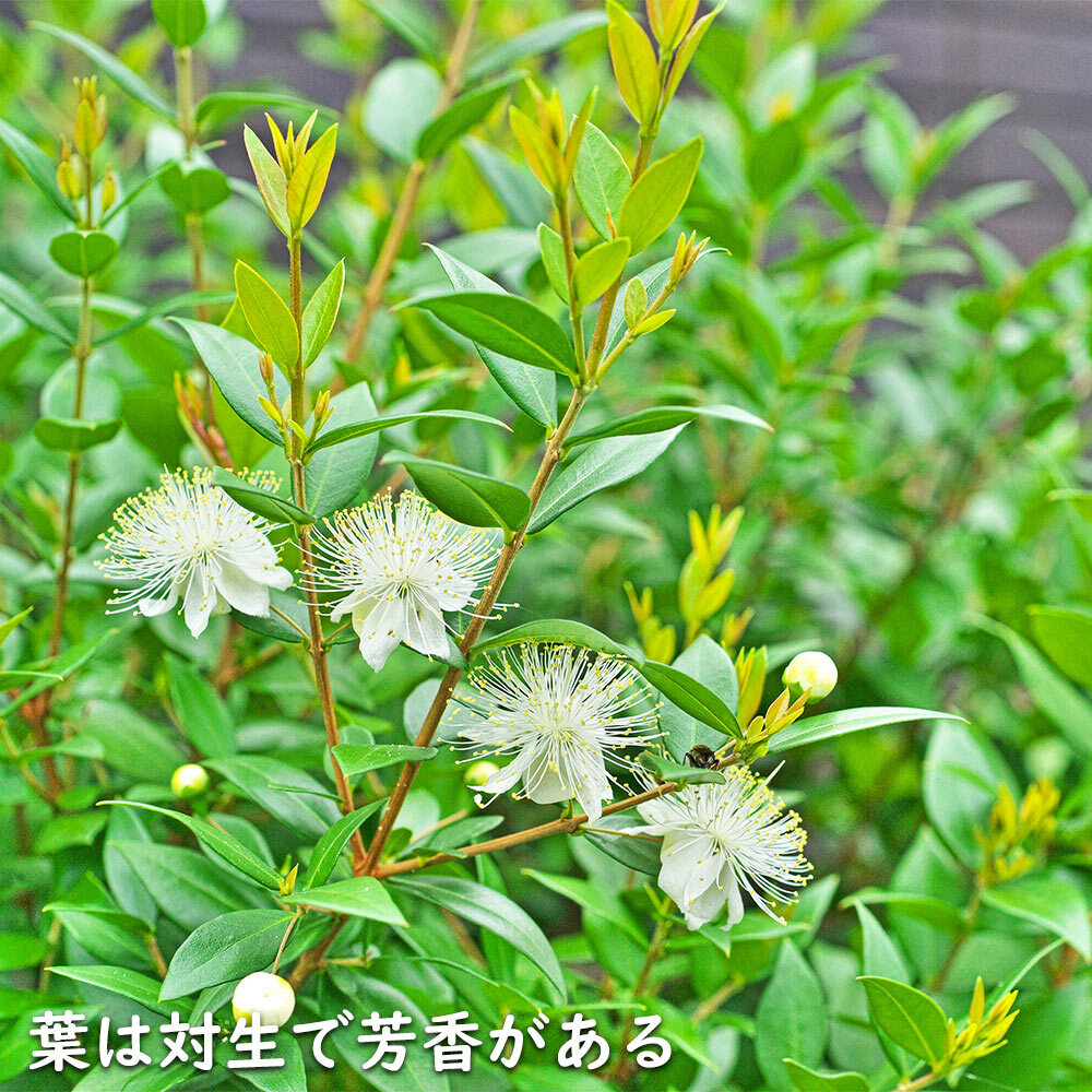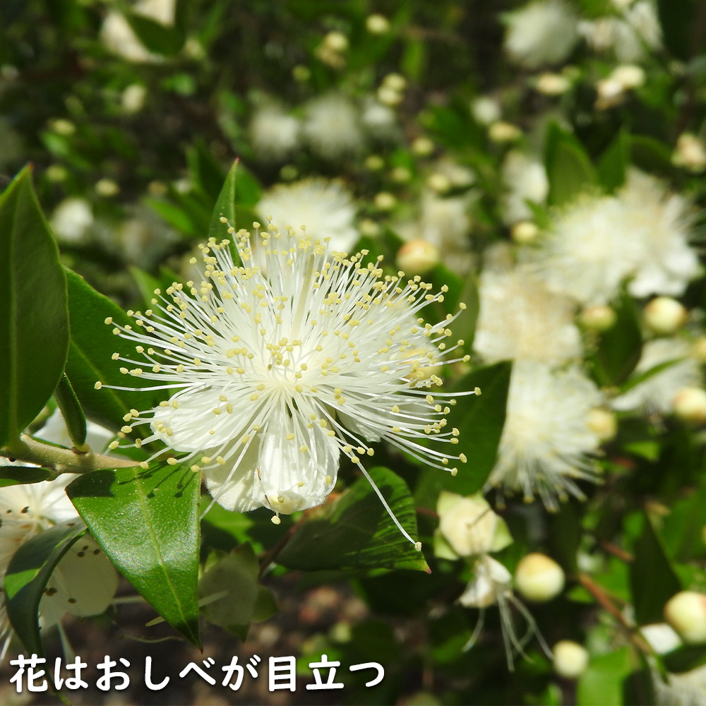 ギンバイカは3m程度になる常緑高木です。初夏に花糸が目立つ純白の花が咲きます。多く咲きとても見栄えがします。葉は芳香がありハーブとしても使われます。実は開きに黒青色に熟し、食用にも利用できます。常緑品種で3m程度までなるため生垣としても利用されます。斑入り品種などもあります。